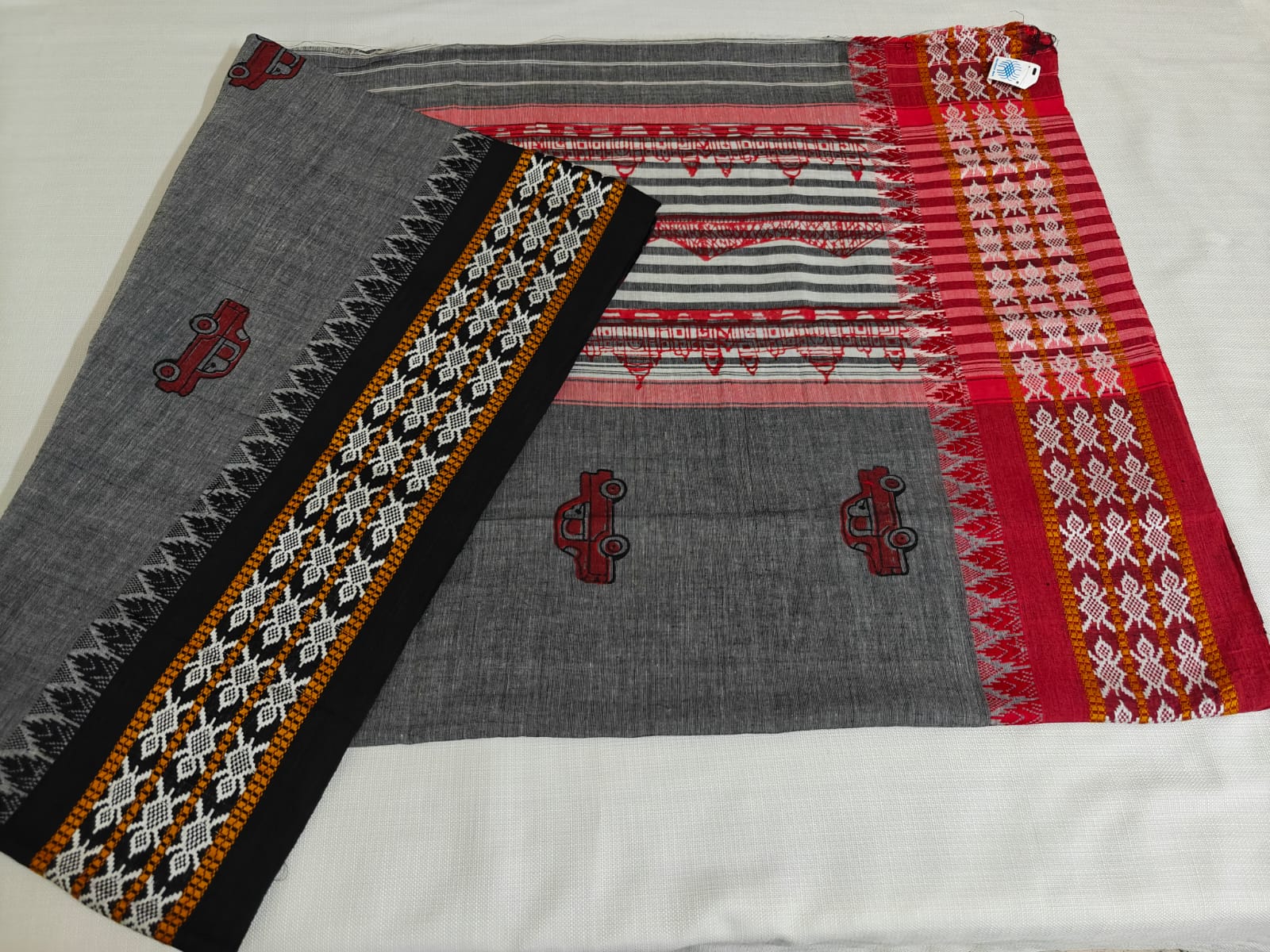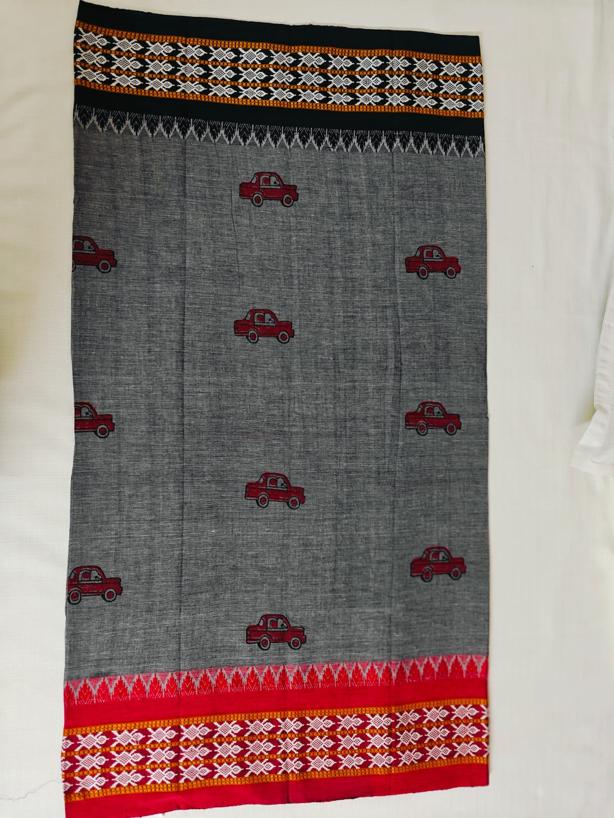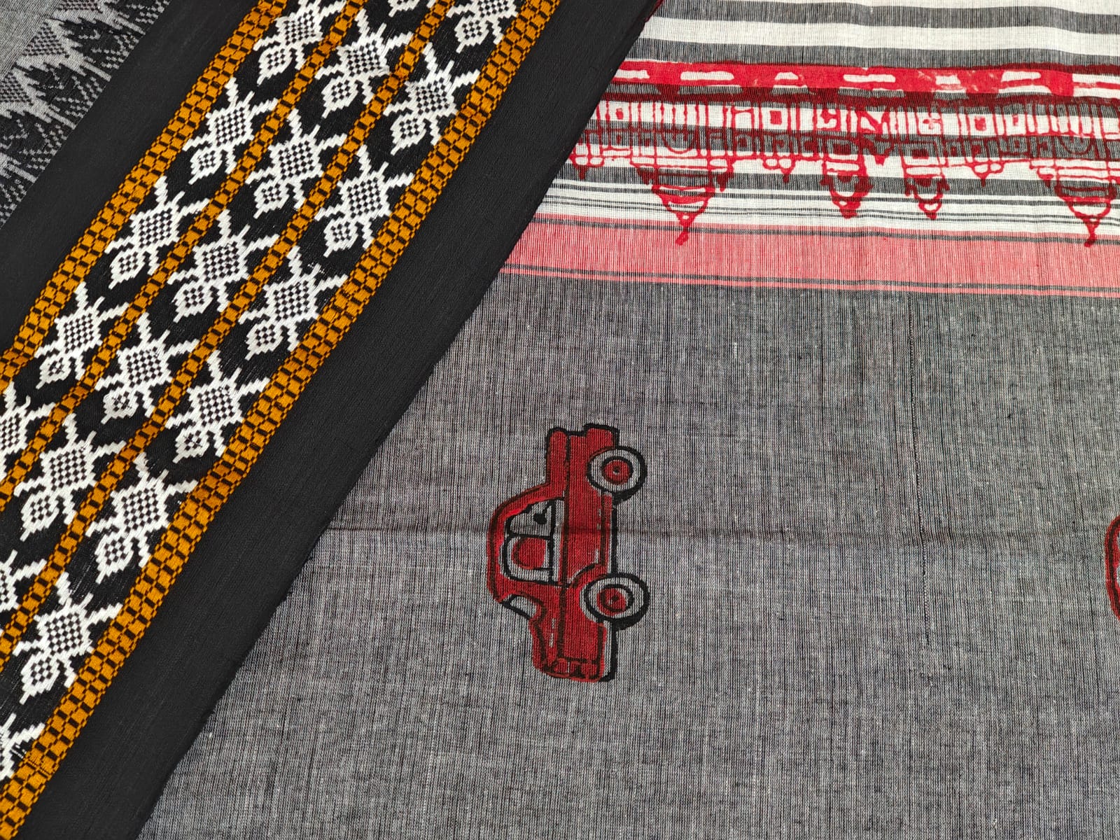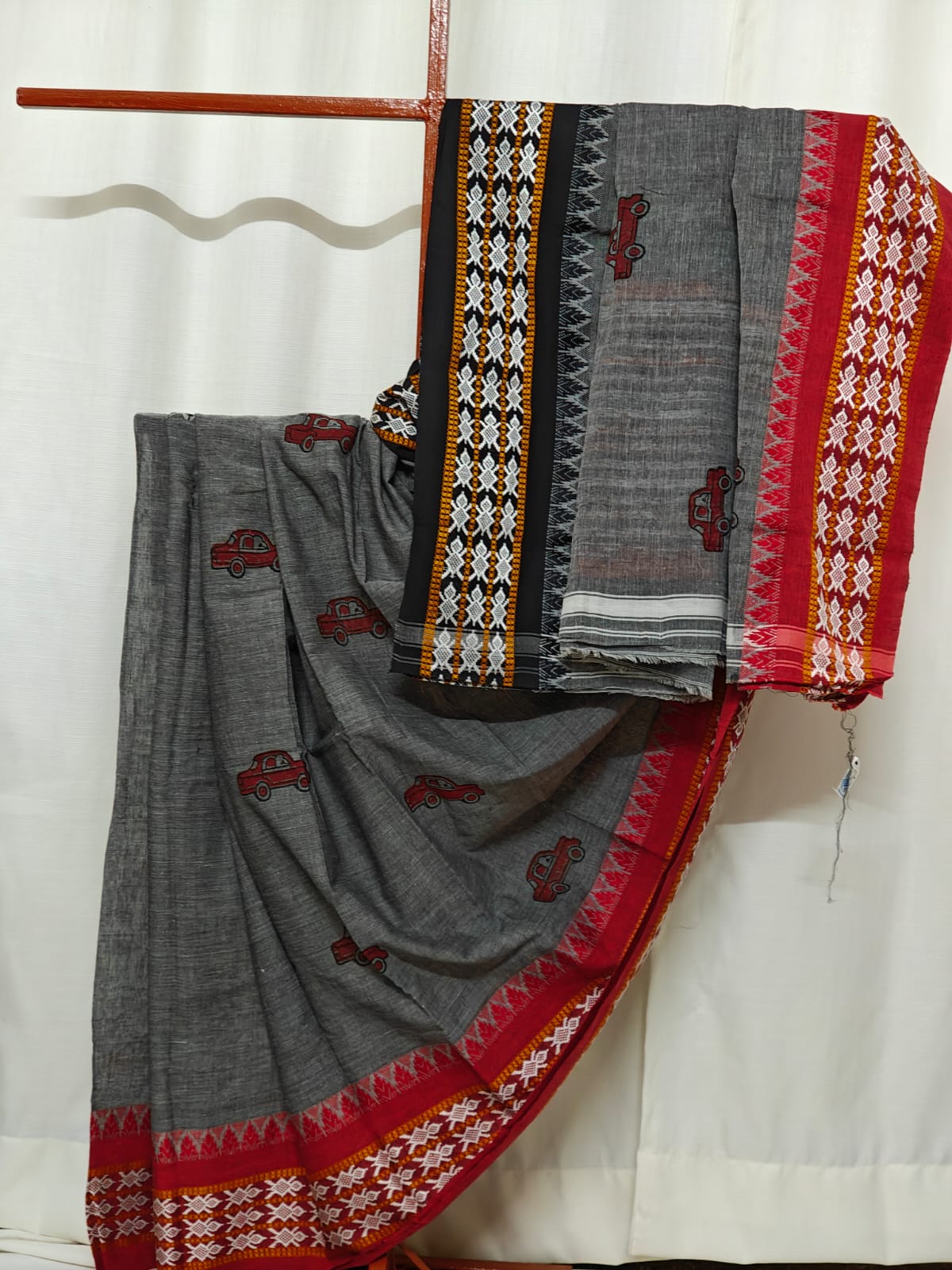 Description: Classic Kolkata motifs with Howrah Bridge and the Victoria Memorial on the borders and old Ambassador taxis on the body. The saree has a 'khejur chhori' aanchal/pallu Handloom Mark certified.