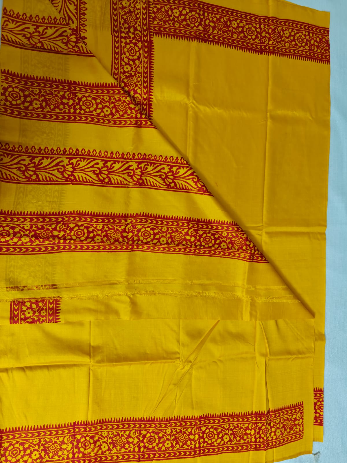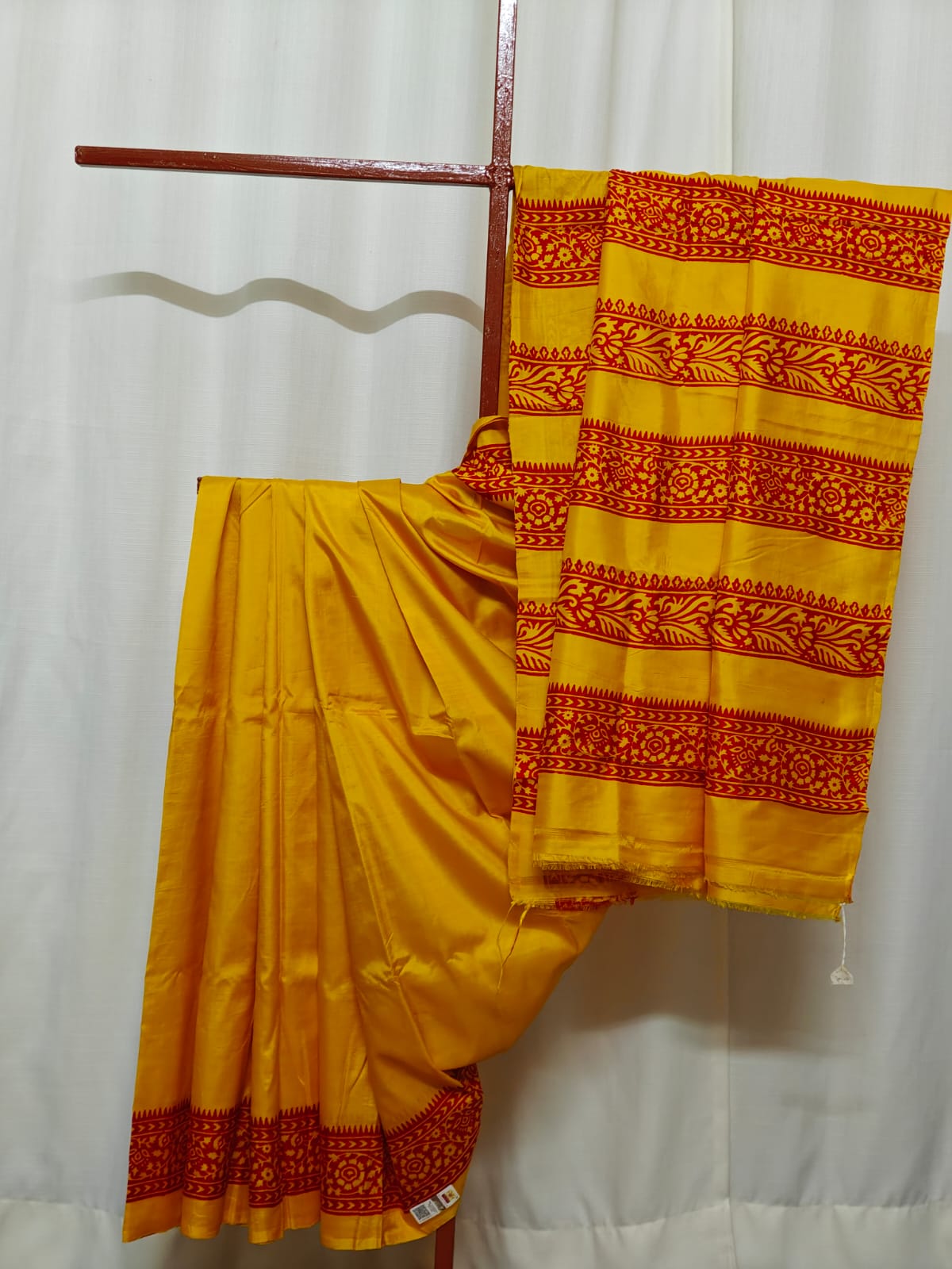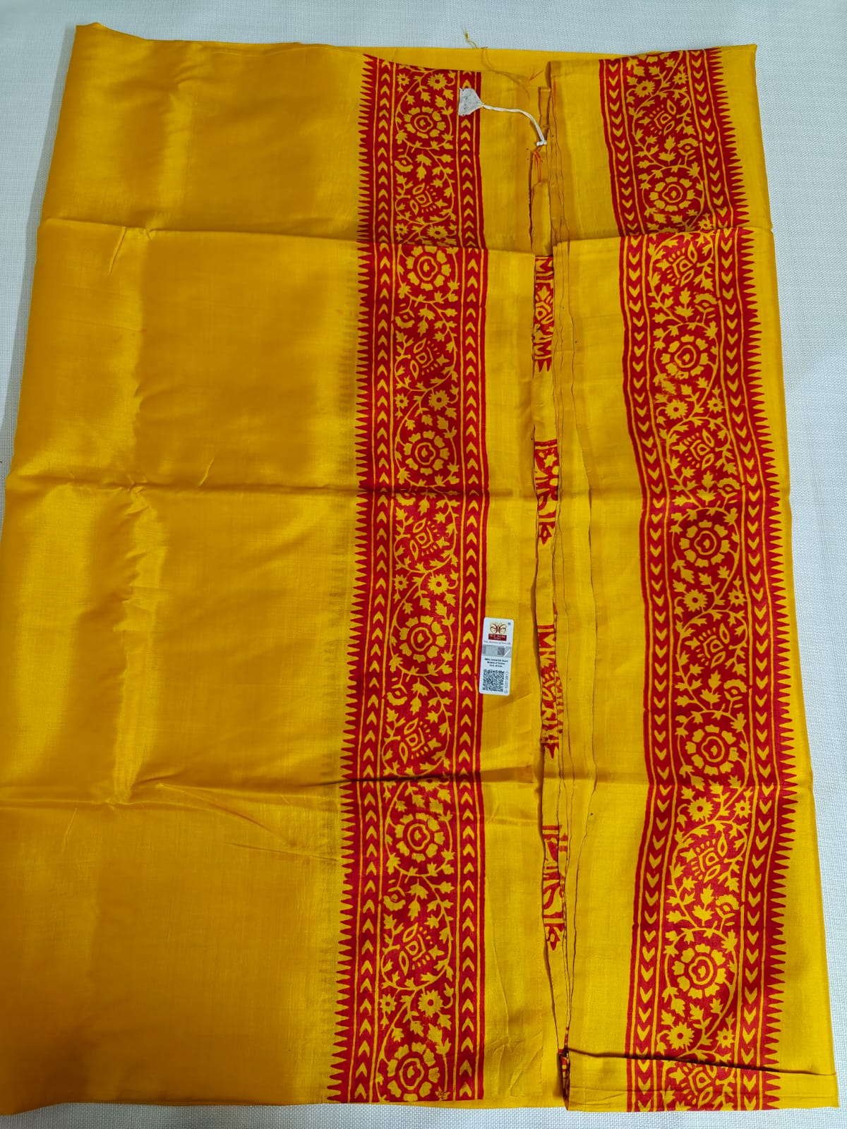 Description: Yellow with floral motifs of crimson. Silk Mark certified.