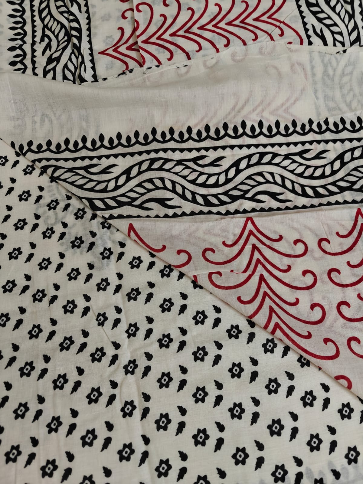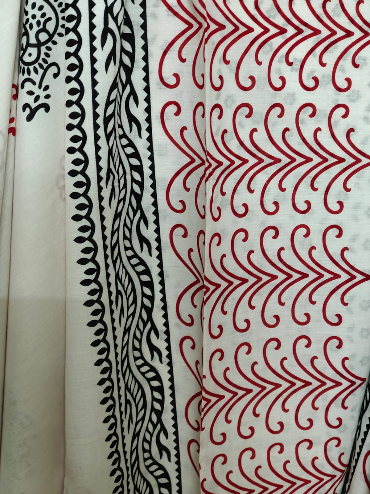 Description: Subtle yet elegant geometric and floral motifs with black and red on white.