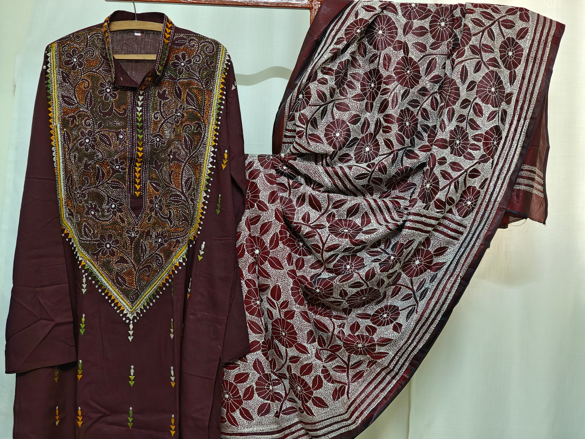 Description: We recommend pairing this gorgeous reverse katha embroidered blended Bangalore silk saree with the cotton panjabi for evenings out.