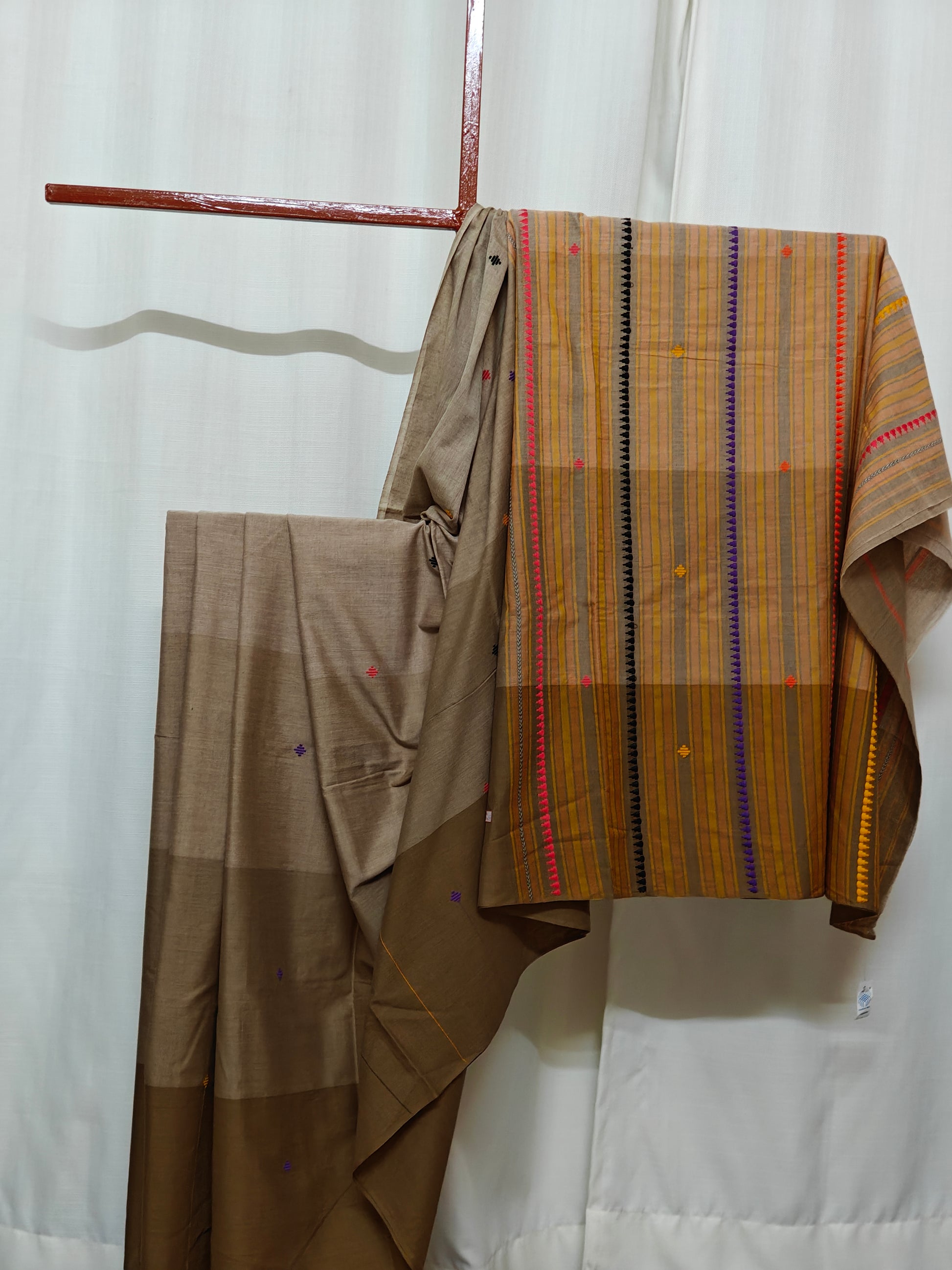 Fabric: Dhonekhali cotton by cotton (tana aar poren) with hand loom and patterns expressed by hand operated shittle (maku). The sarees are not starched.