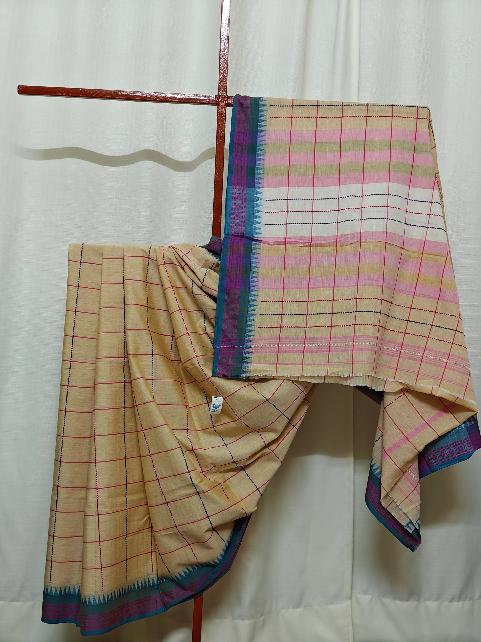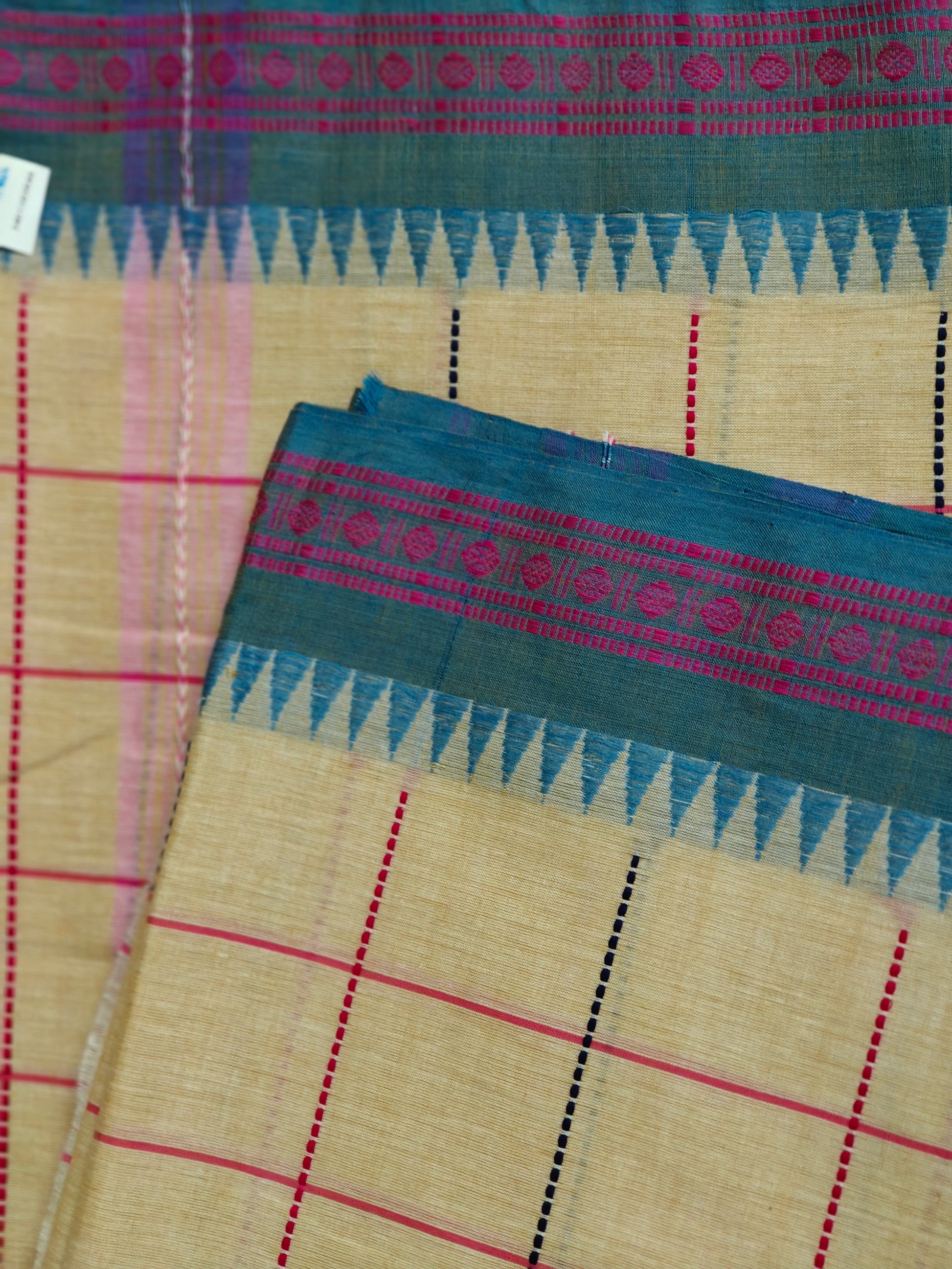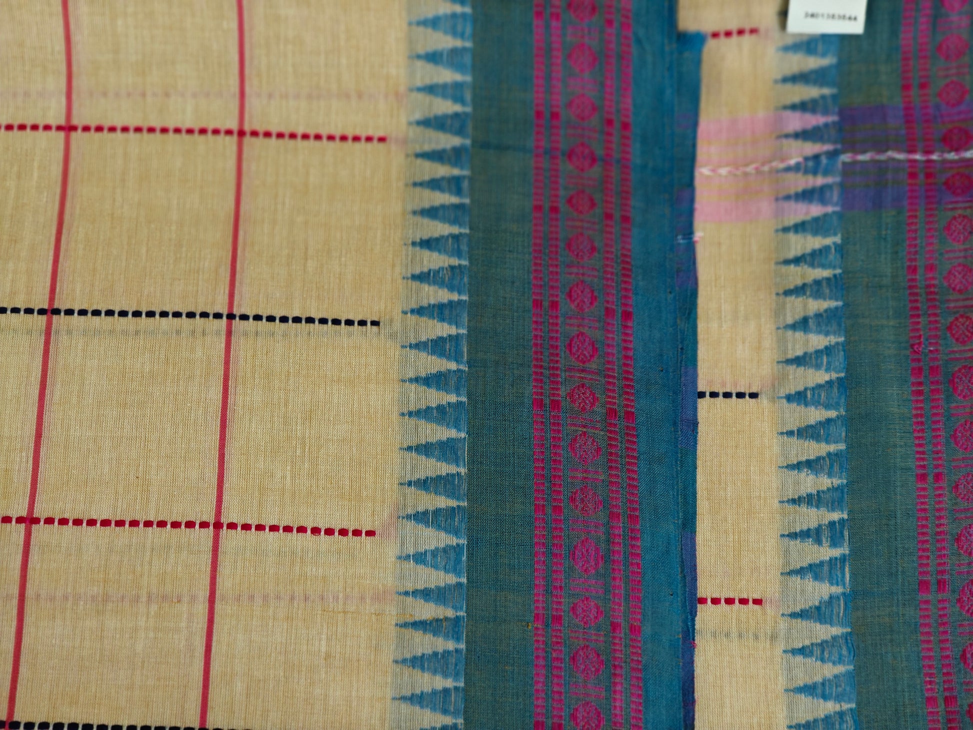Description: Dhonekhali cotton with khejur chhodi aanchol/pallu. Handloom Mark certified.