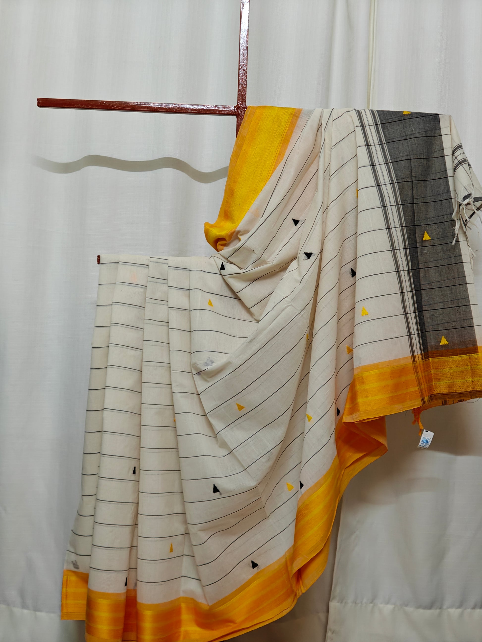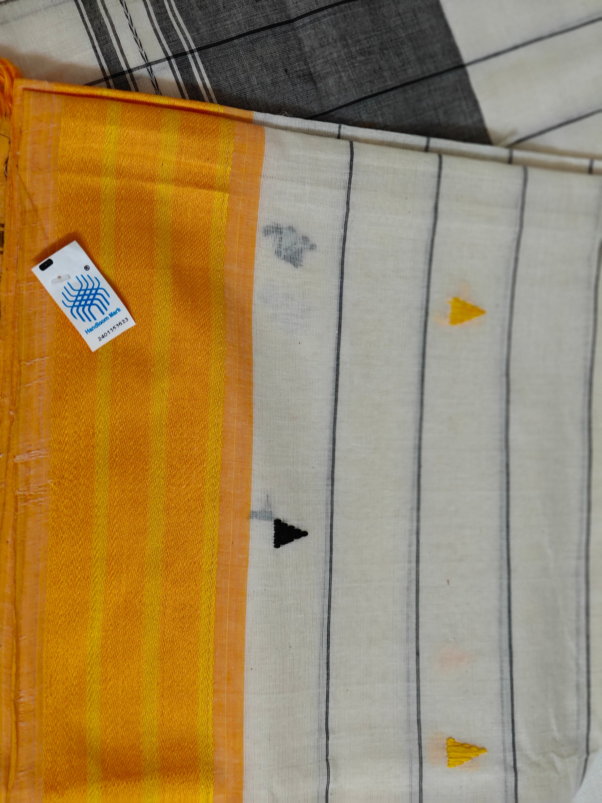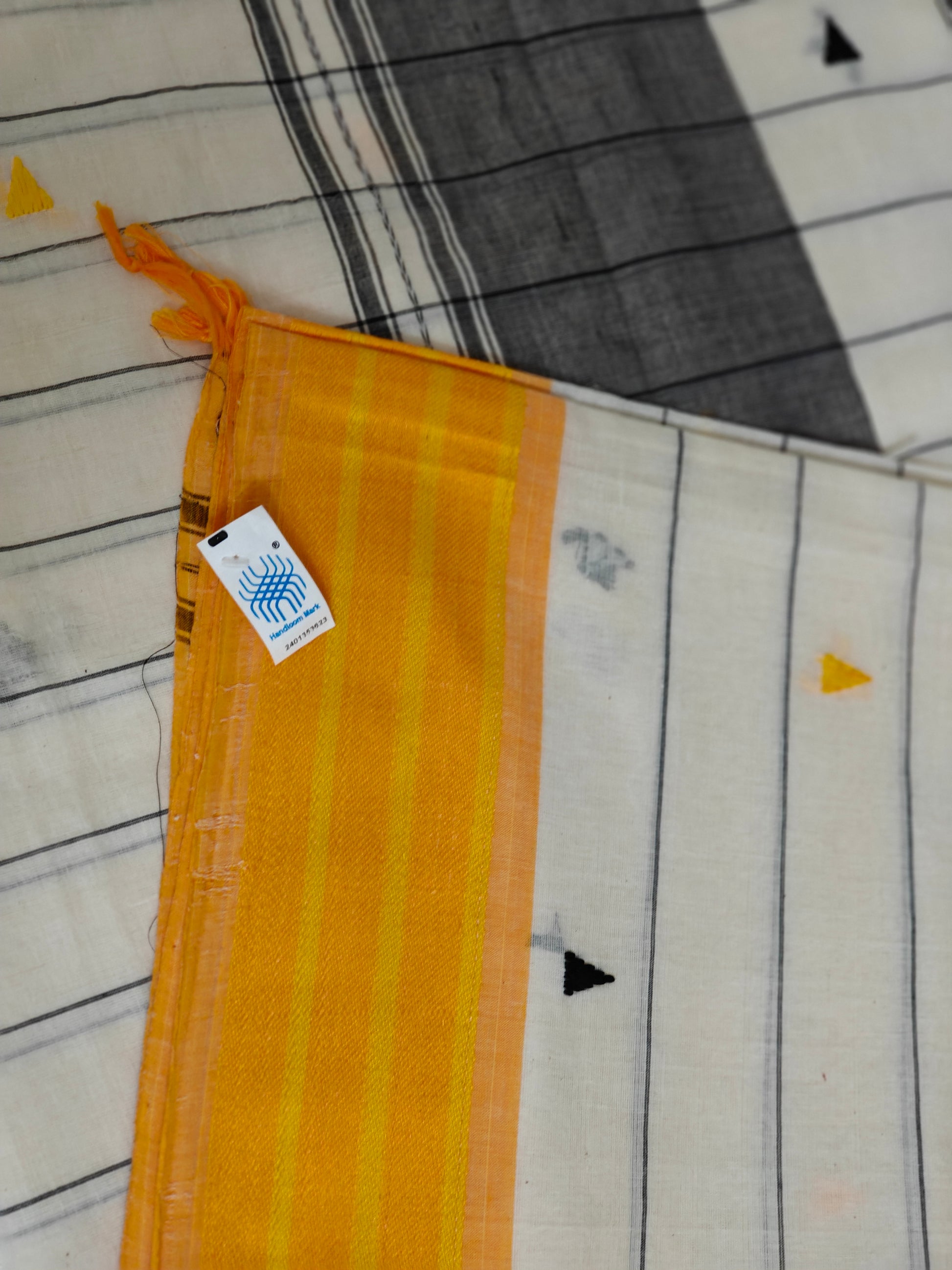 Description: White with yellow and black accents and geometric motifs. Handloom Mark certified.