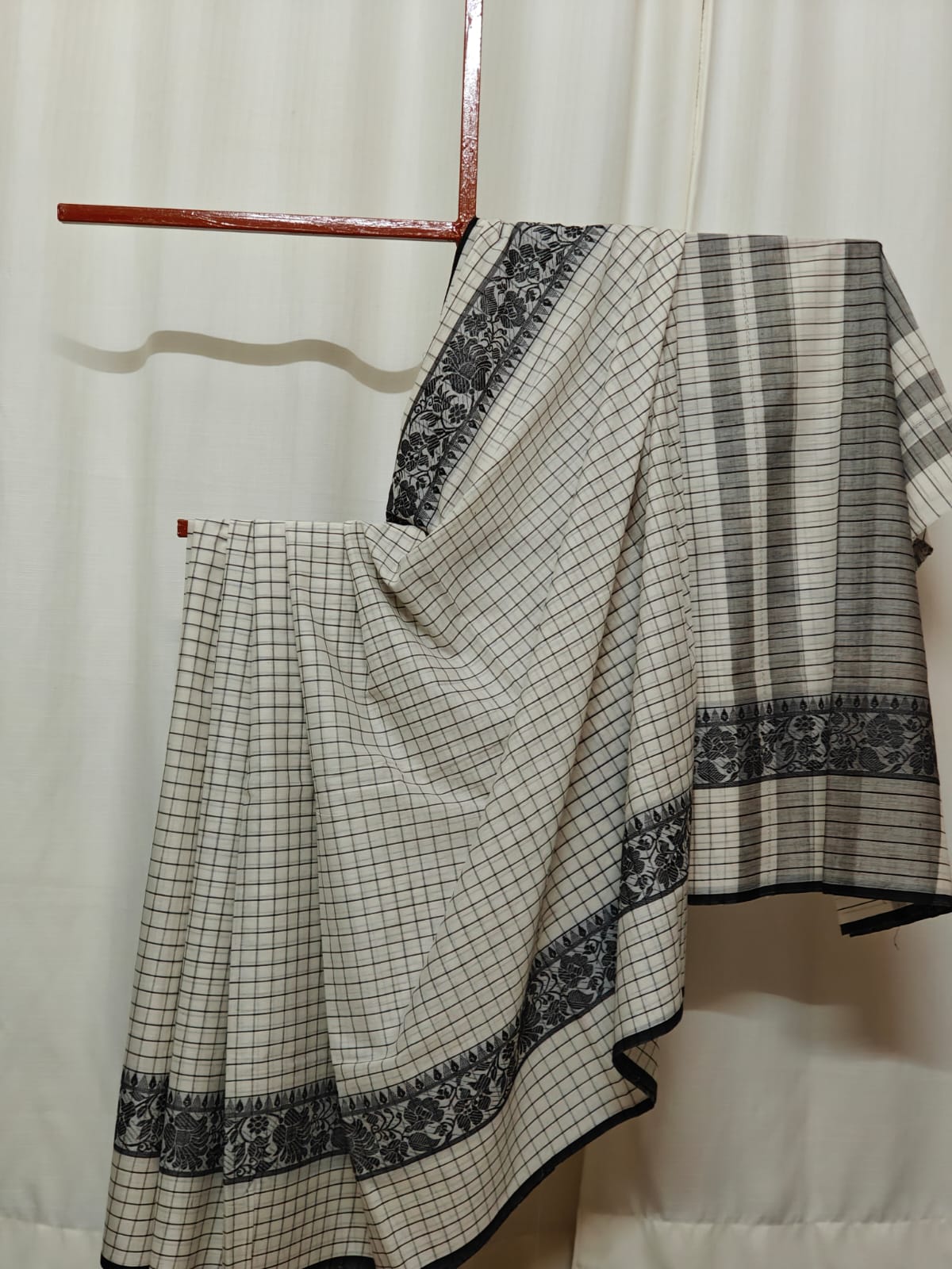 Fabric: Dhonekhali cotton by cotton (tana aar poren) with hand loom and patterns expressed by hand operated shittle (maku). The sarees are not starched.
