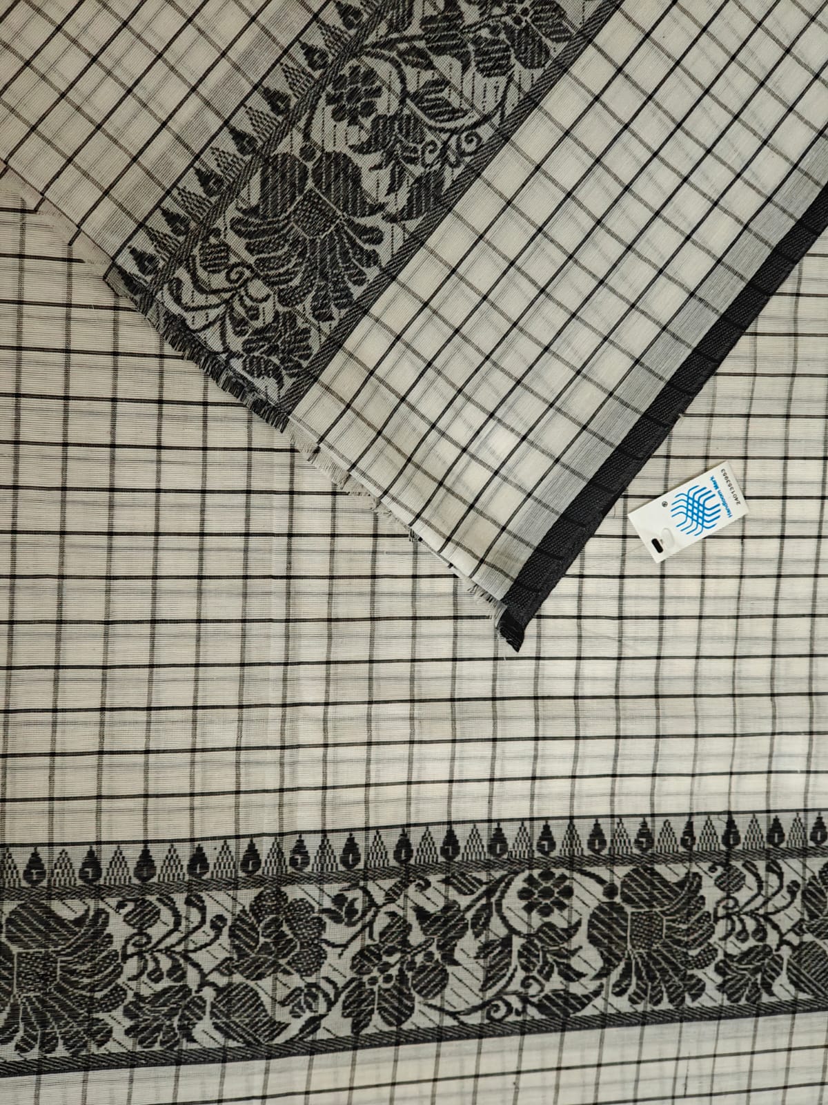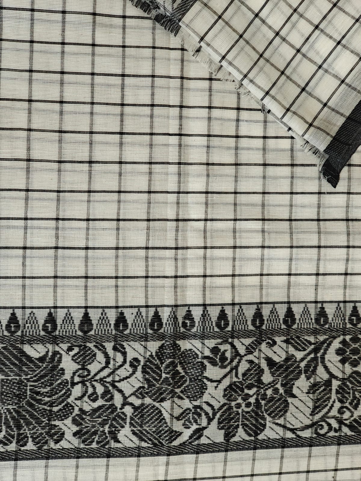 Description: Cotton with intricate floral motif on the borders. Handloom Mark certified.