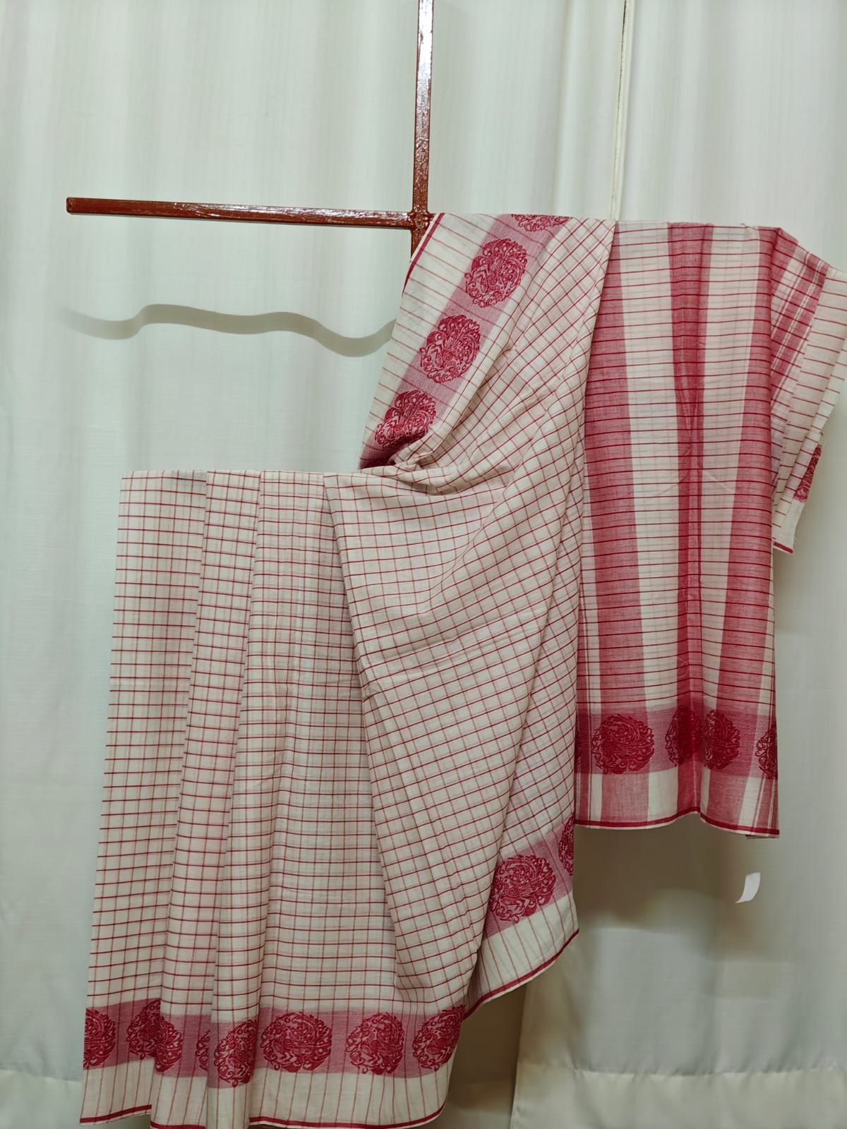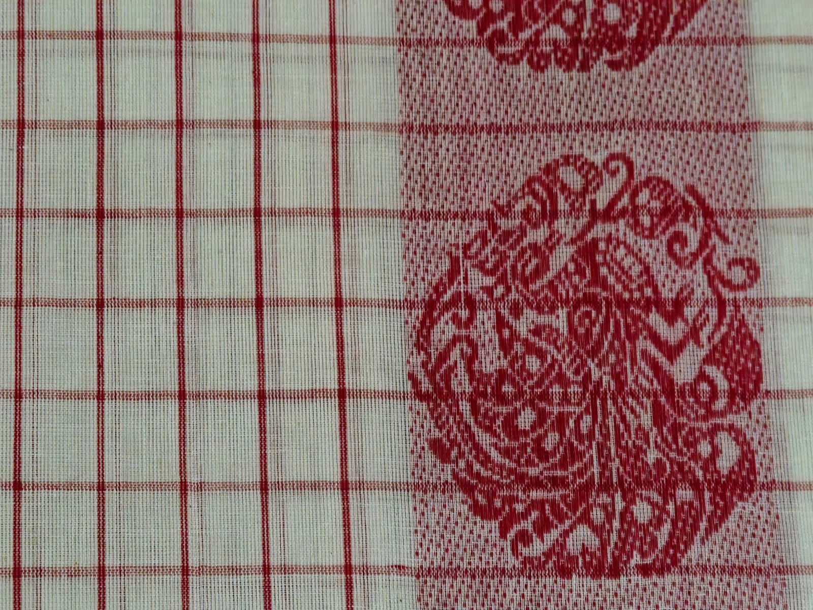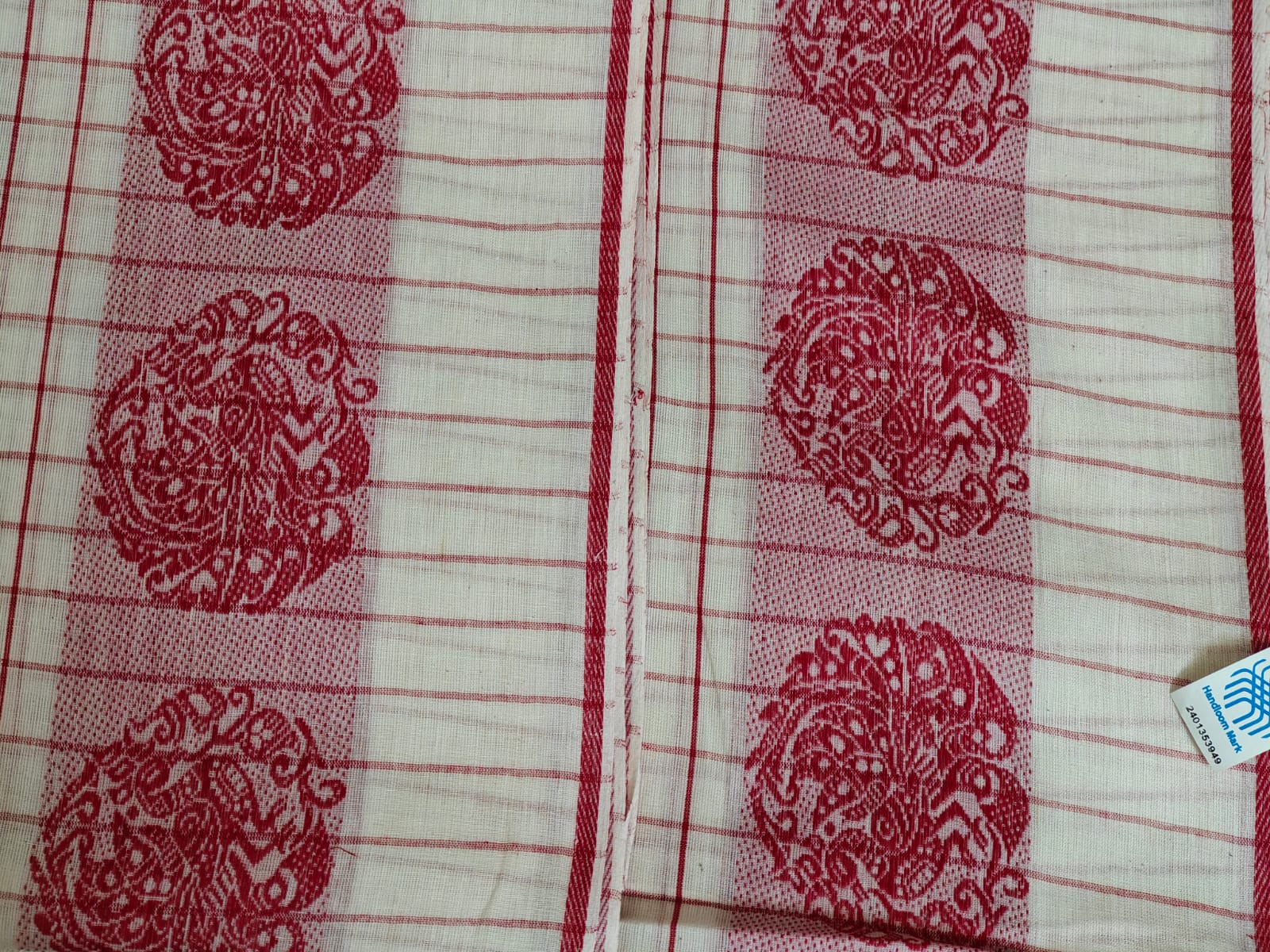 Description: White with red maku work and intricate geometric motifs on the borders. Handloom Mark certified.