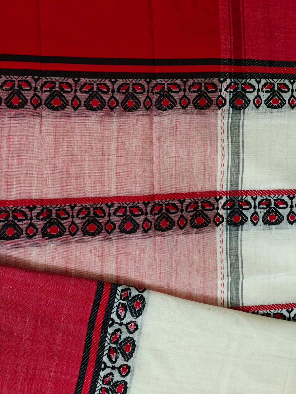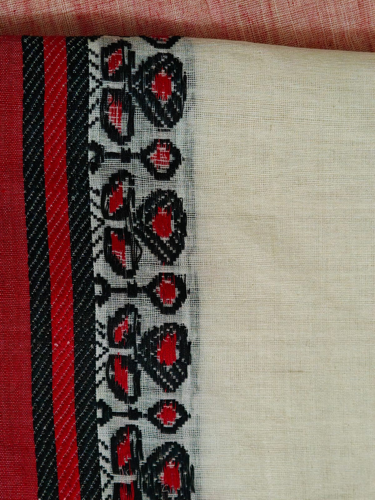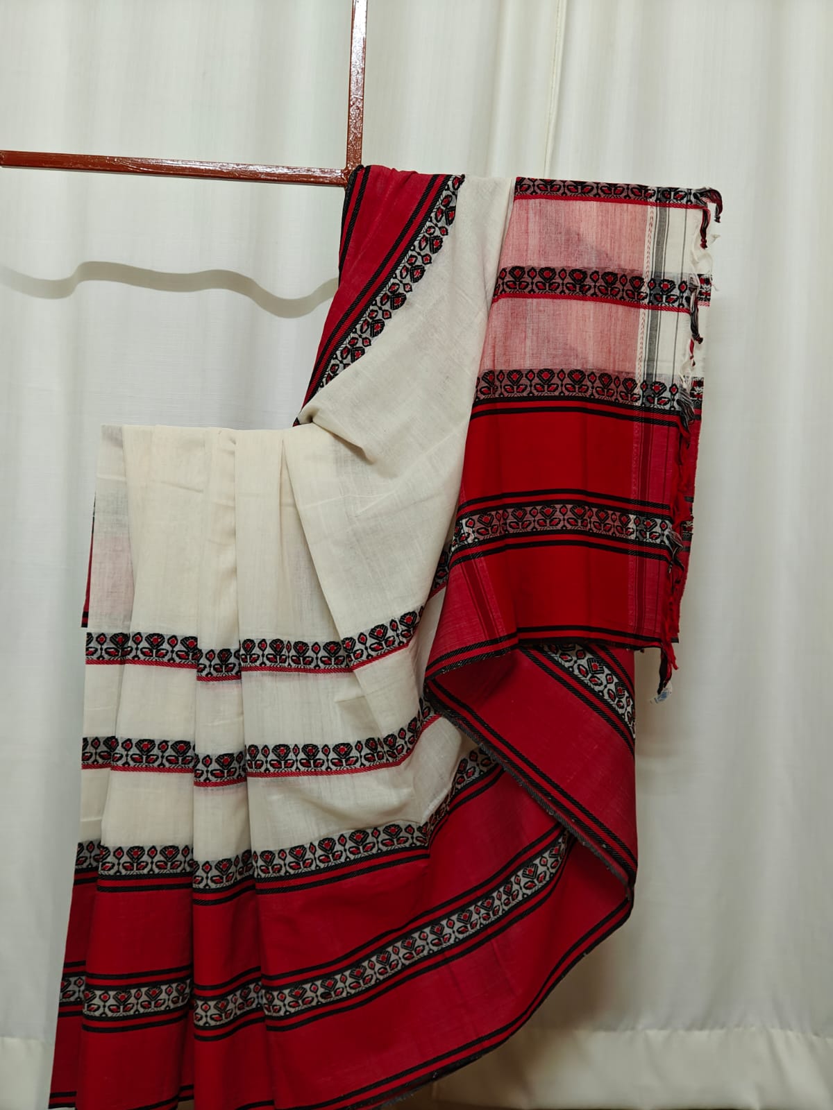 Description: White background with red and black accents and floral motif on the borders. Handloom Mark certified.