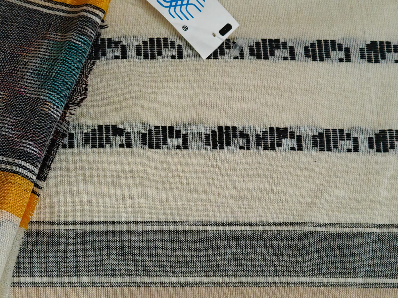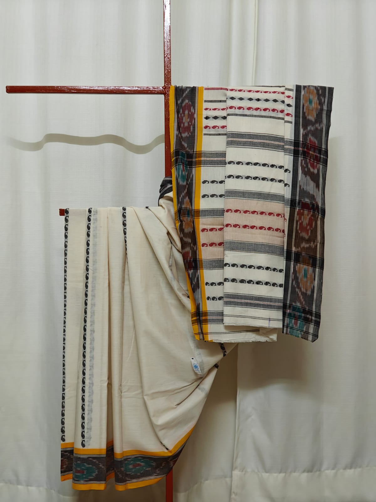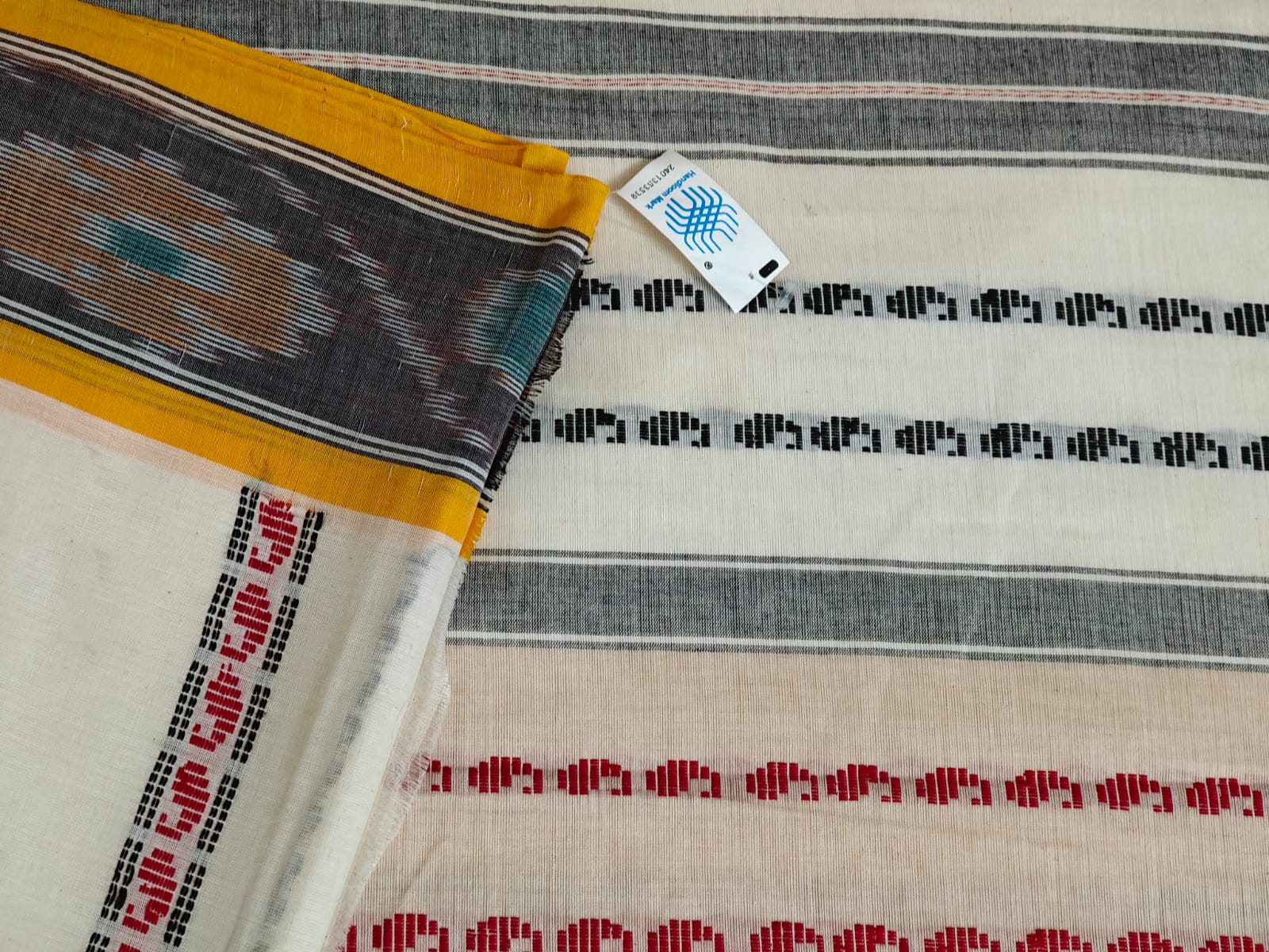 Description: White background bearing a 'kotki' border more commonly present in handiwork from Odisha. Handloom Mark certified.