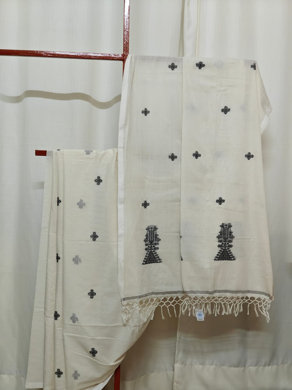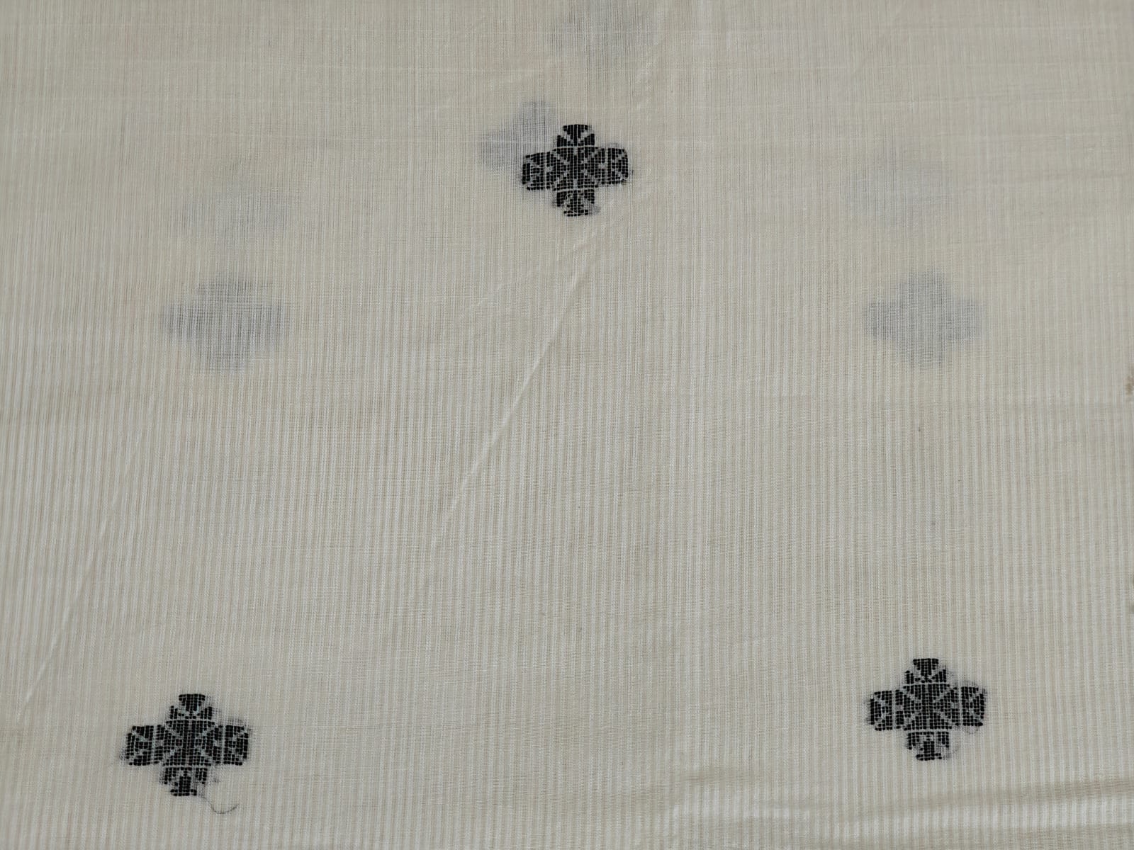 Description: Kora coloured with accents of black and bearing geometric and temple motifs. Handloom Mark certified.