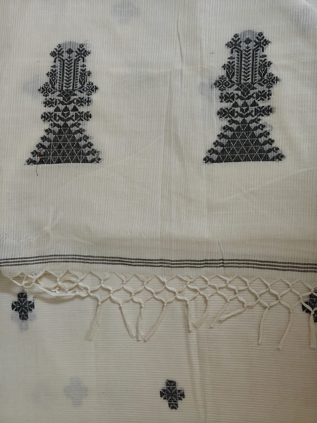 Fabric: Dhonekhali cotton by cotton (tana aar poren) with hand loom and patterns expressed by hand operated shittle (maku). The sarees are not starched.