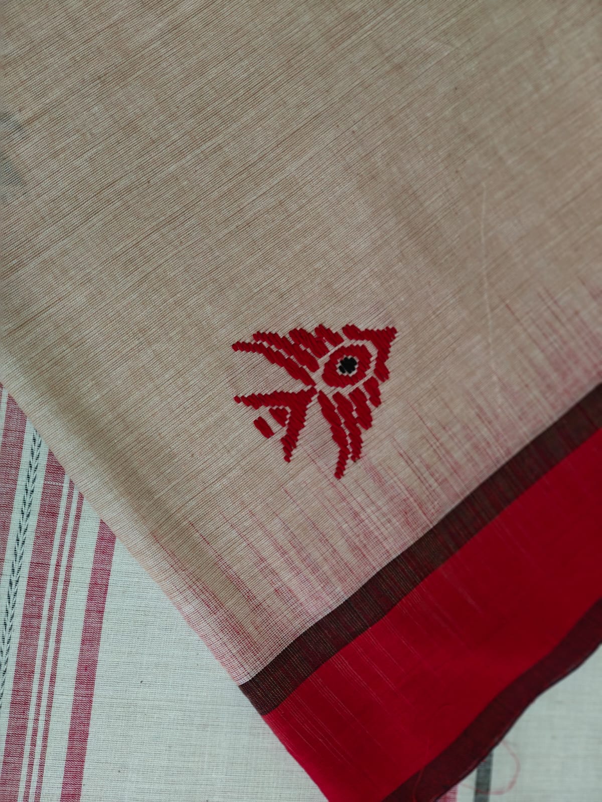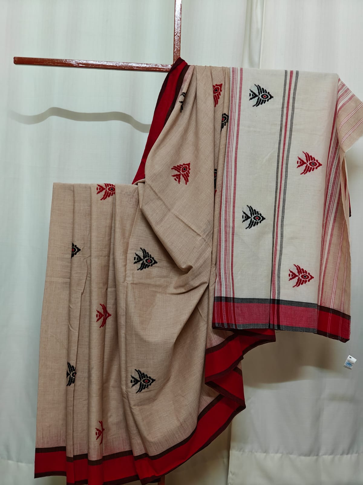 Fabric: Dhonekhali cotton by cotton (tana aar poren) with hand loom and patterns expressed by hand operated shittle (maku). The sarees are not starched.