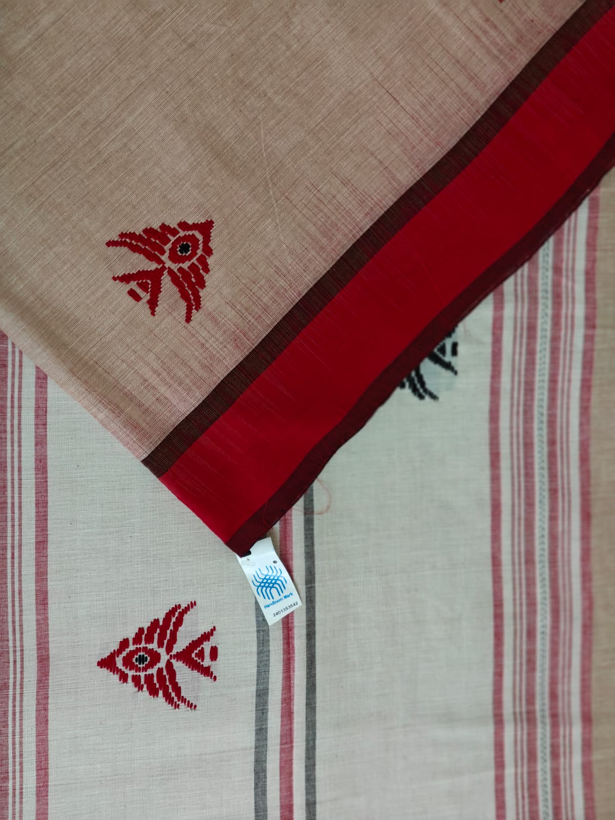 Description: White and cream background with accents of black and red and bearing fish motif. Handloom Mark certified.