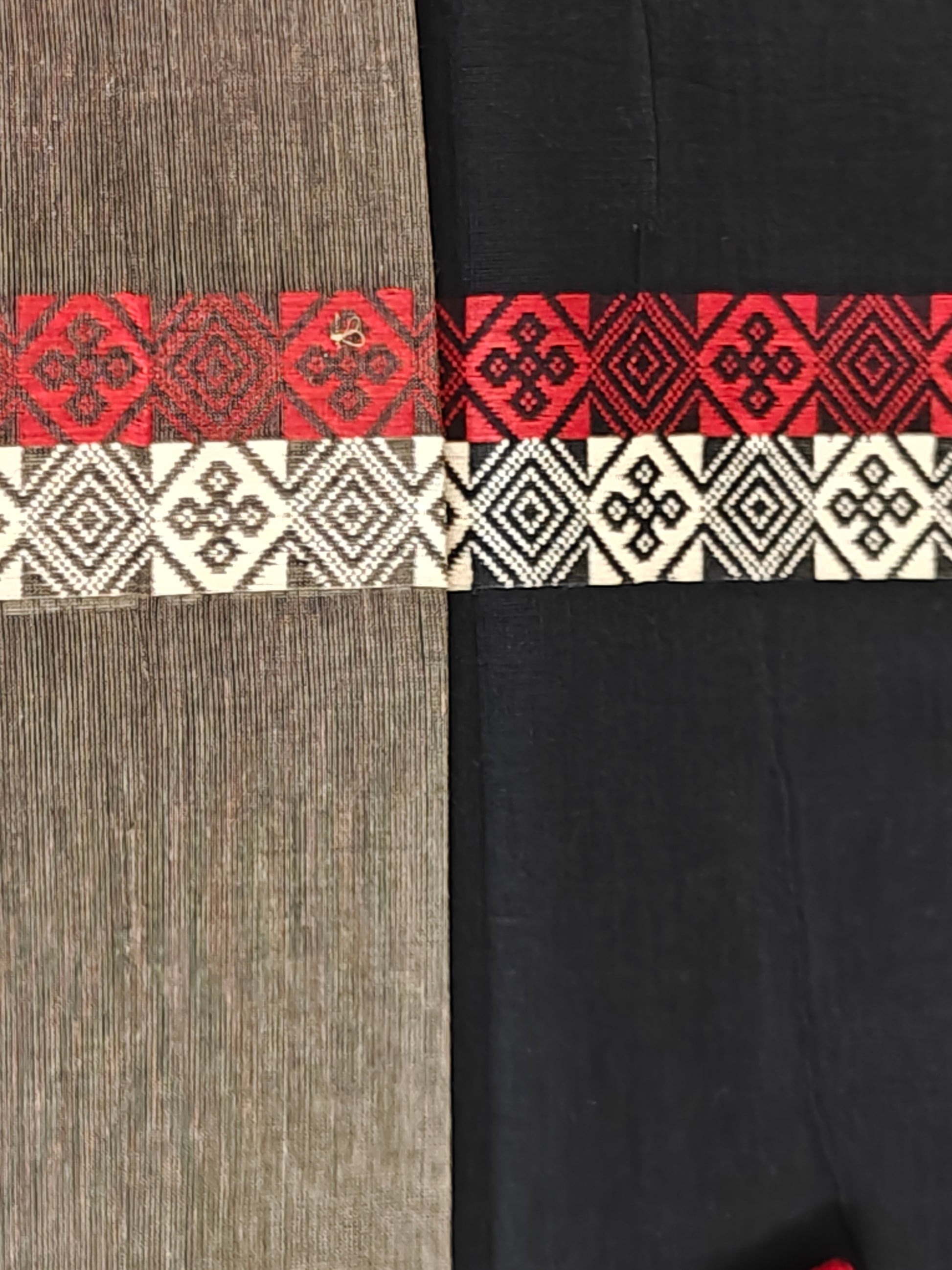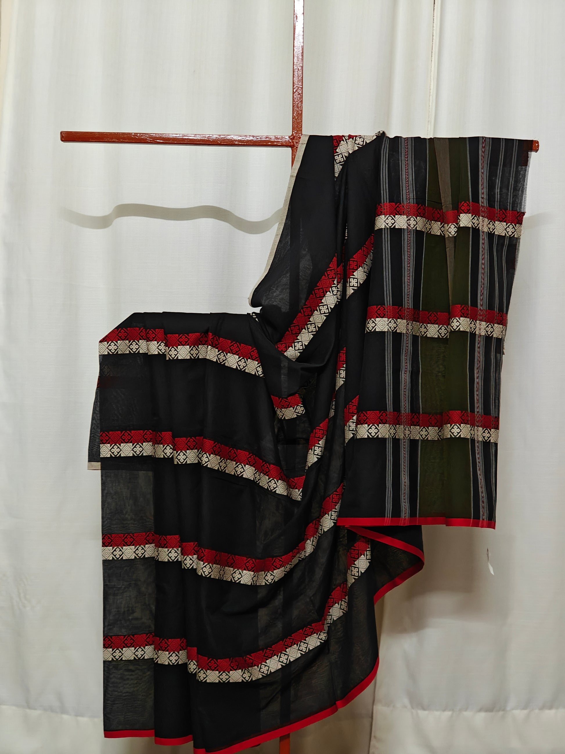 Fabric: Dhonekhali cotton by cotton (tana aar poren) with hand loom and patterns expressed by hand operated shittle (maku). The sarees are not starched.
