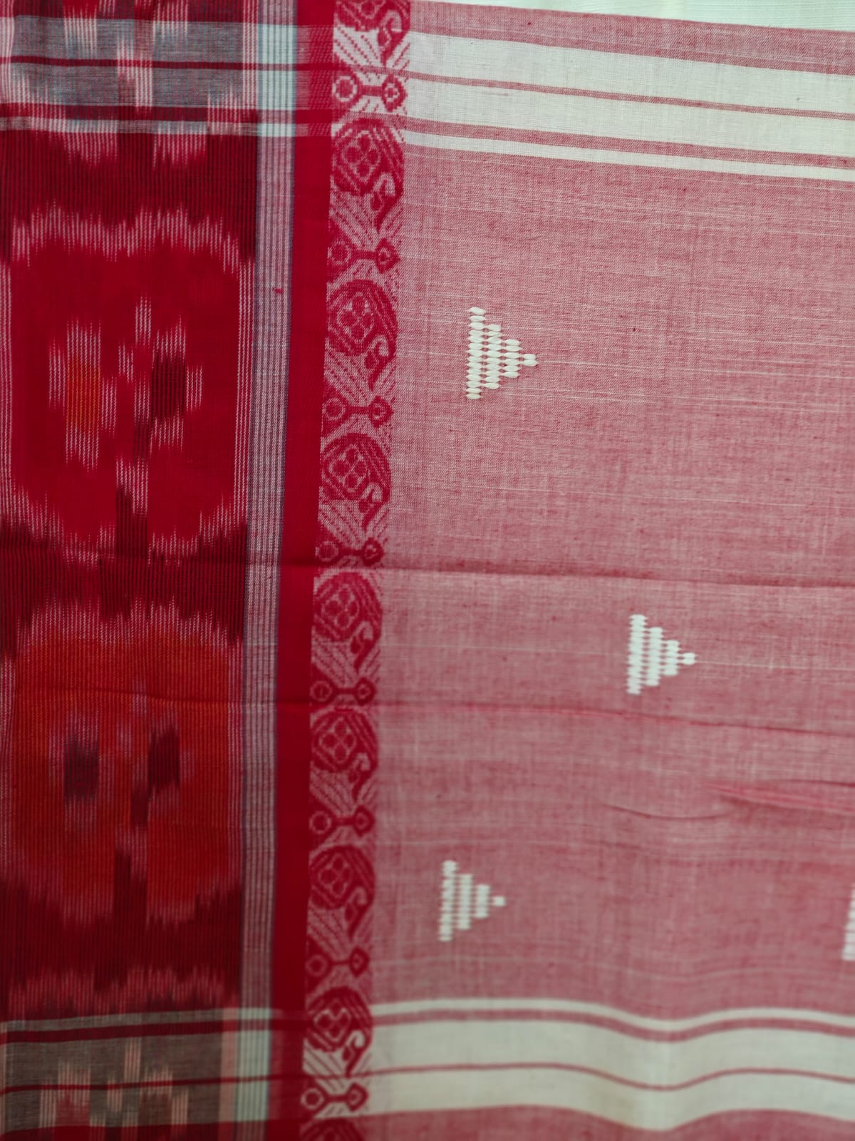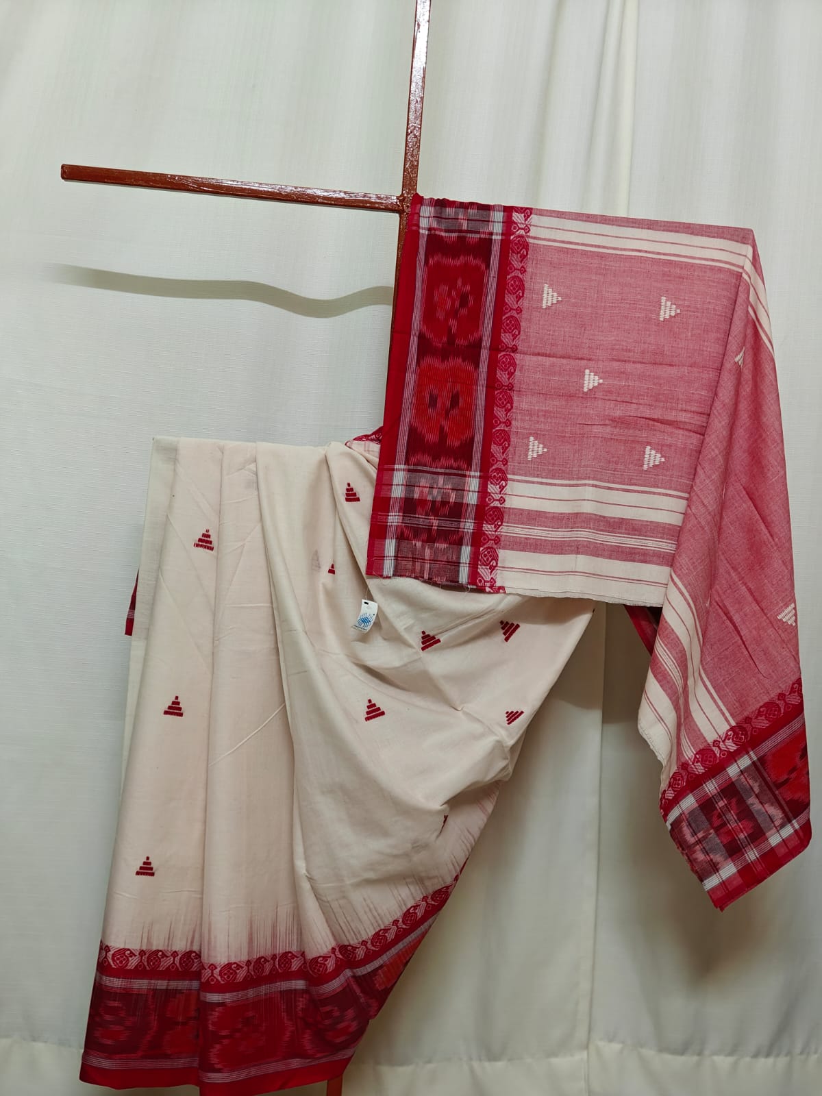 Fabric: Dhonekhali cotton by cotton (tana aar poren) with hand loom and patterns expressed by hand operated shittle (maku). The sarees are not starched.