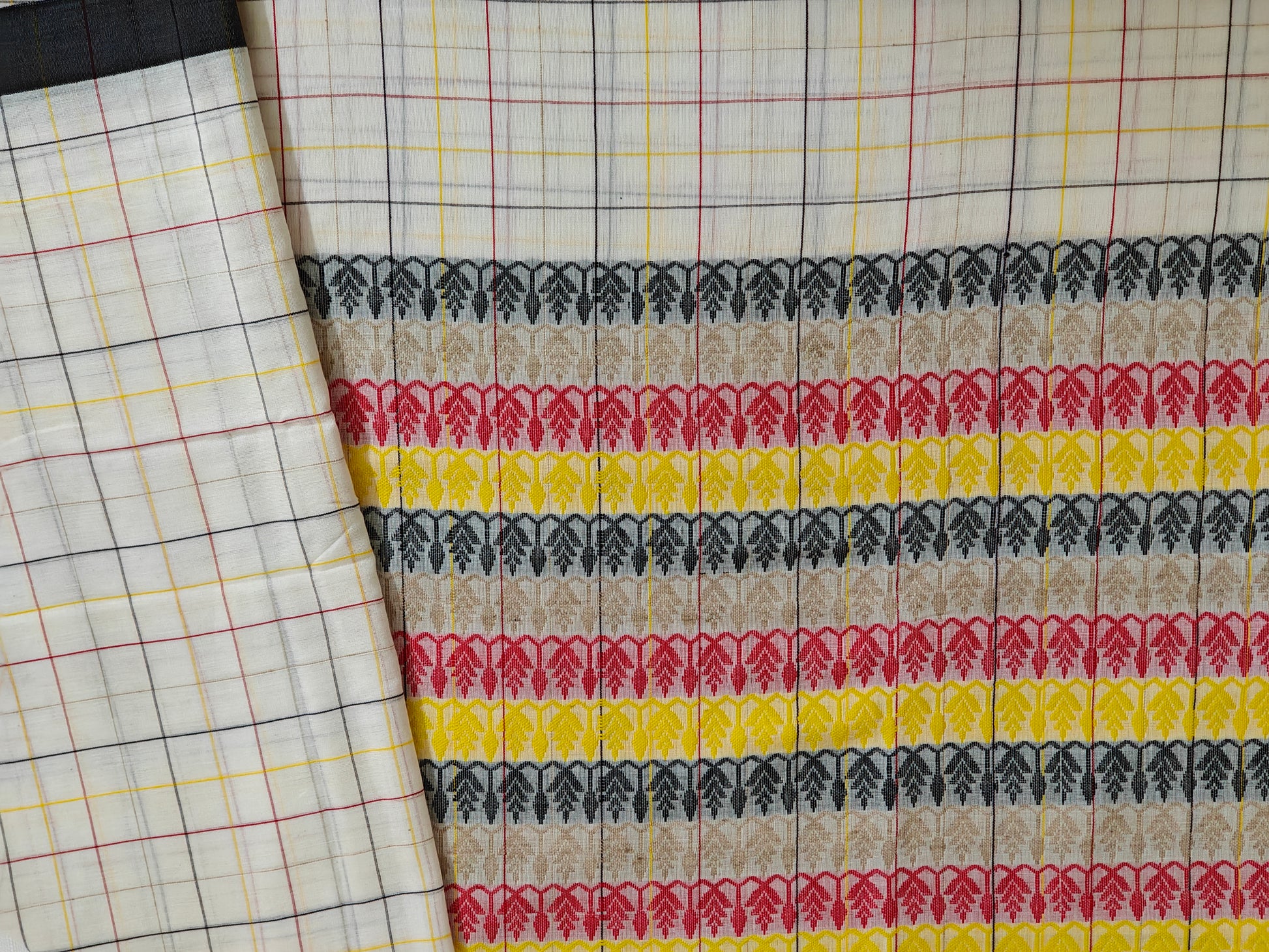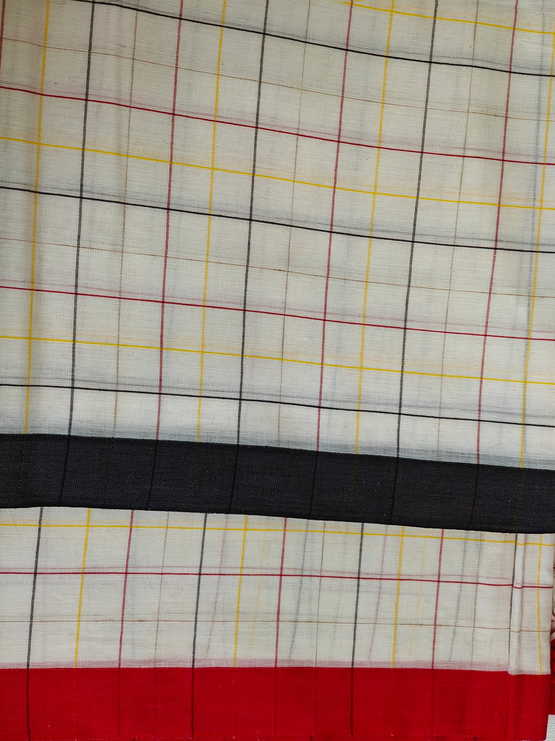 Description: Dhonekhali cotton with maku work and 'Ganga-Jamuna' border. Handloom Mark certified.