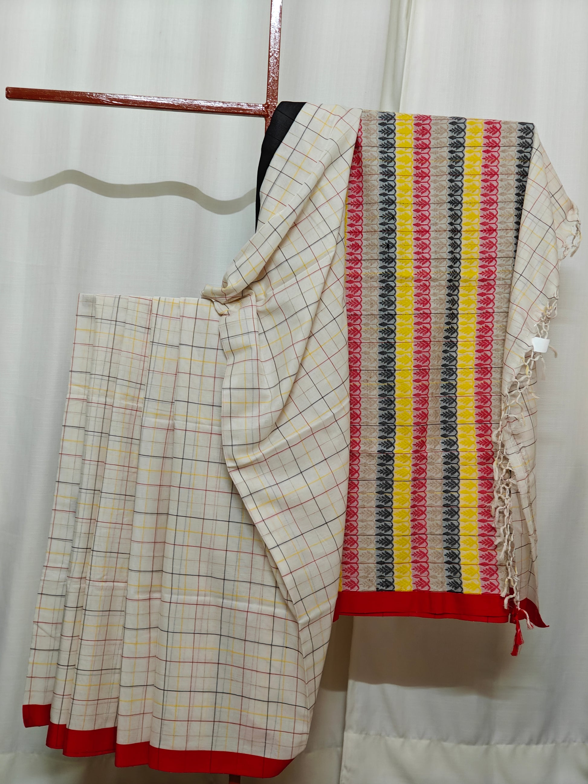 Fabric: Dhonekhali cotton by cotton (tana aar poren) with hand loom and patterns expressed by hand operated shittle (maku). The sarees are not starched.
