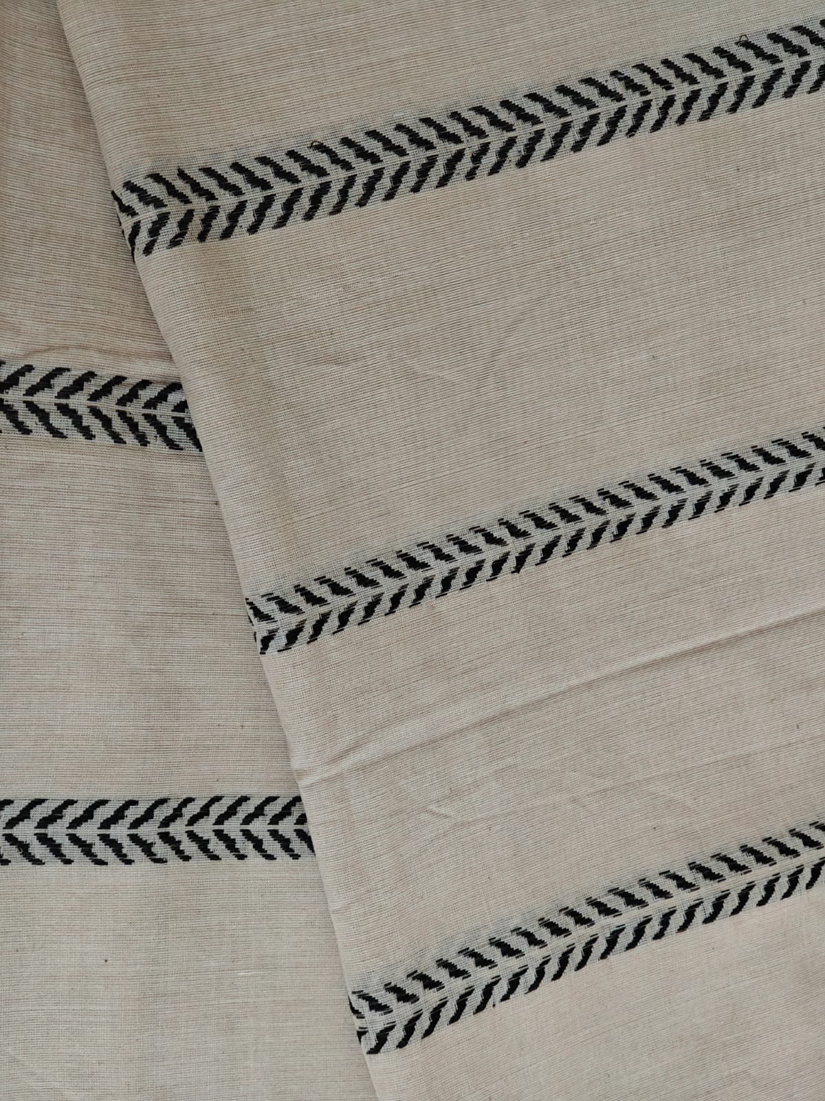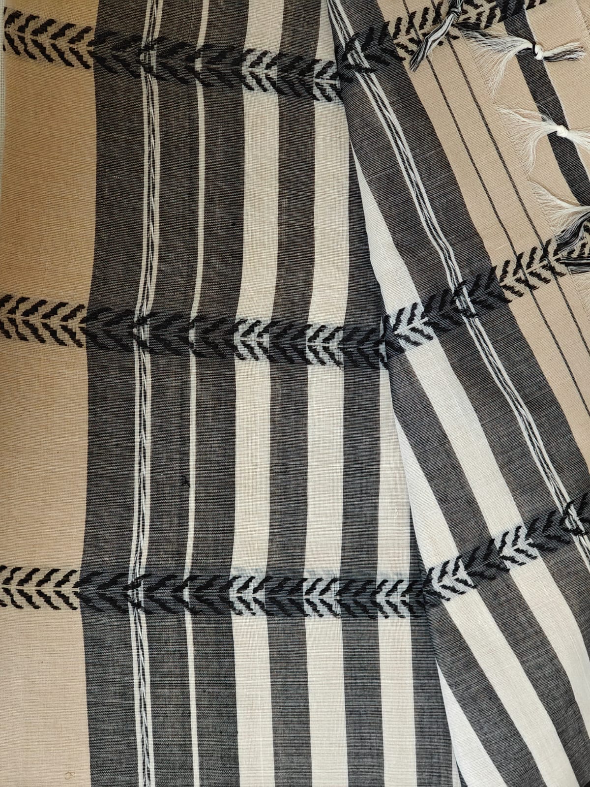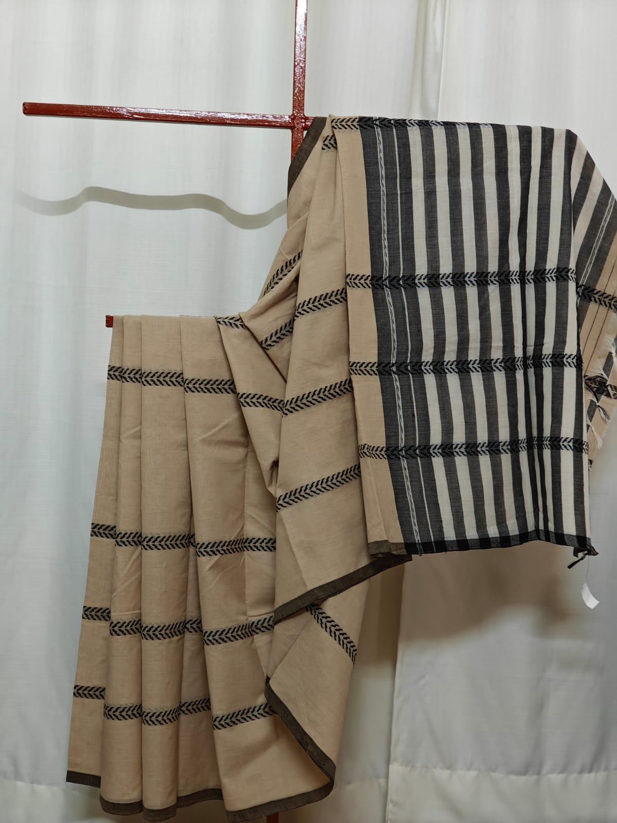 Fabric: Dhonekhali cotton by cotton (tana aar poren) with hand loom and patterns expressed by hand operated shittle (maku). The sarees are not starched.