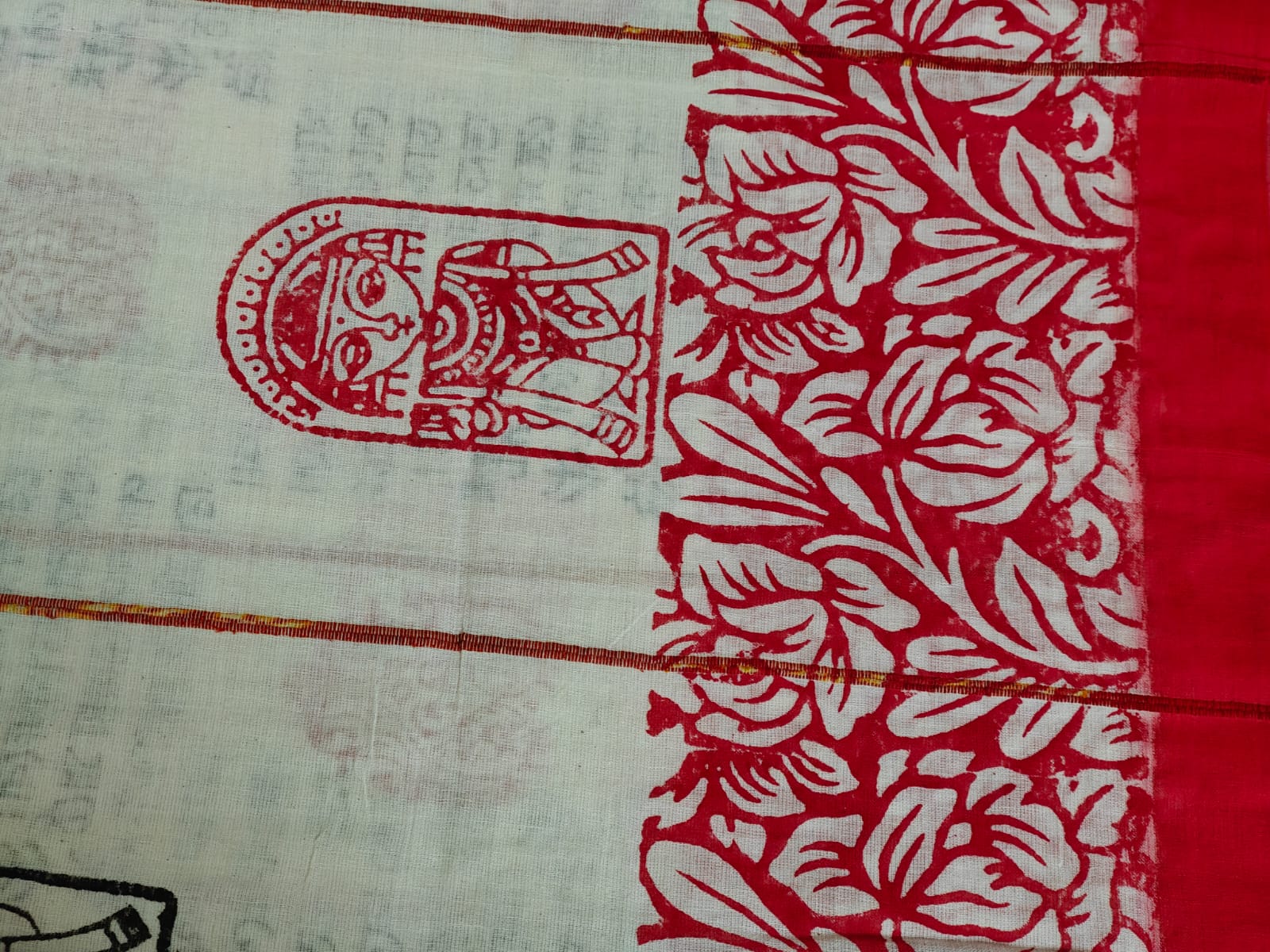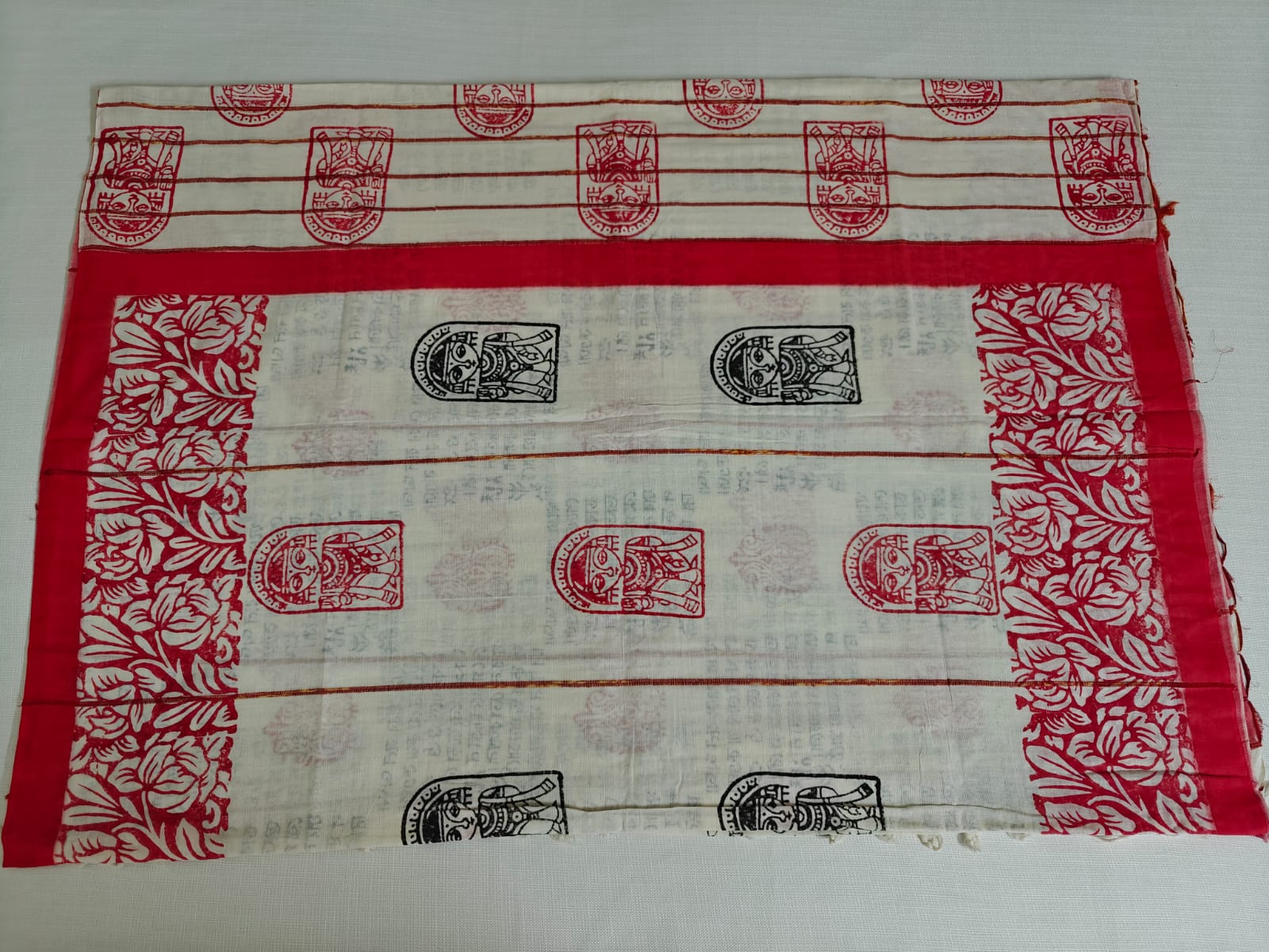 Description: Pure cotton saree with khesh lining. White with figurine motifs.