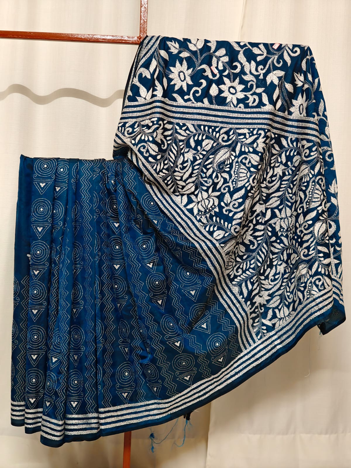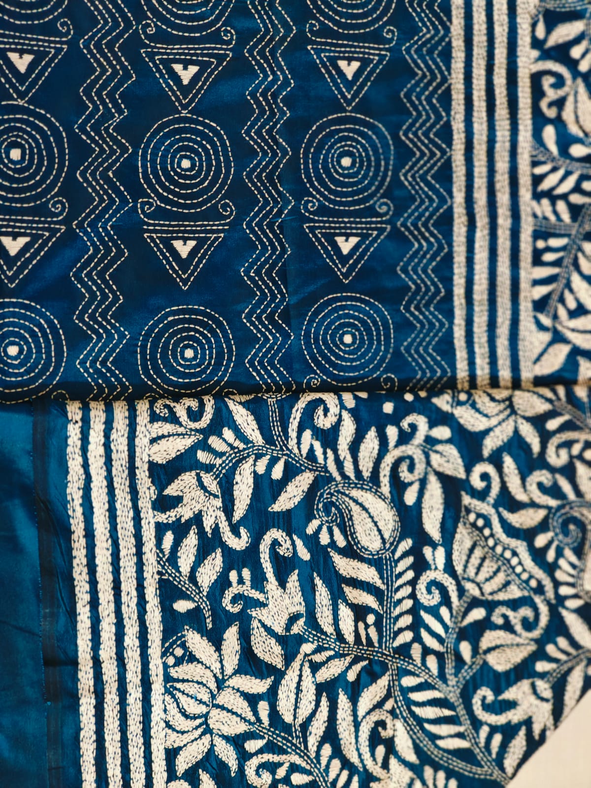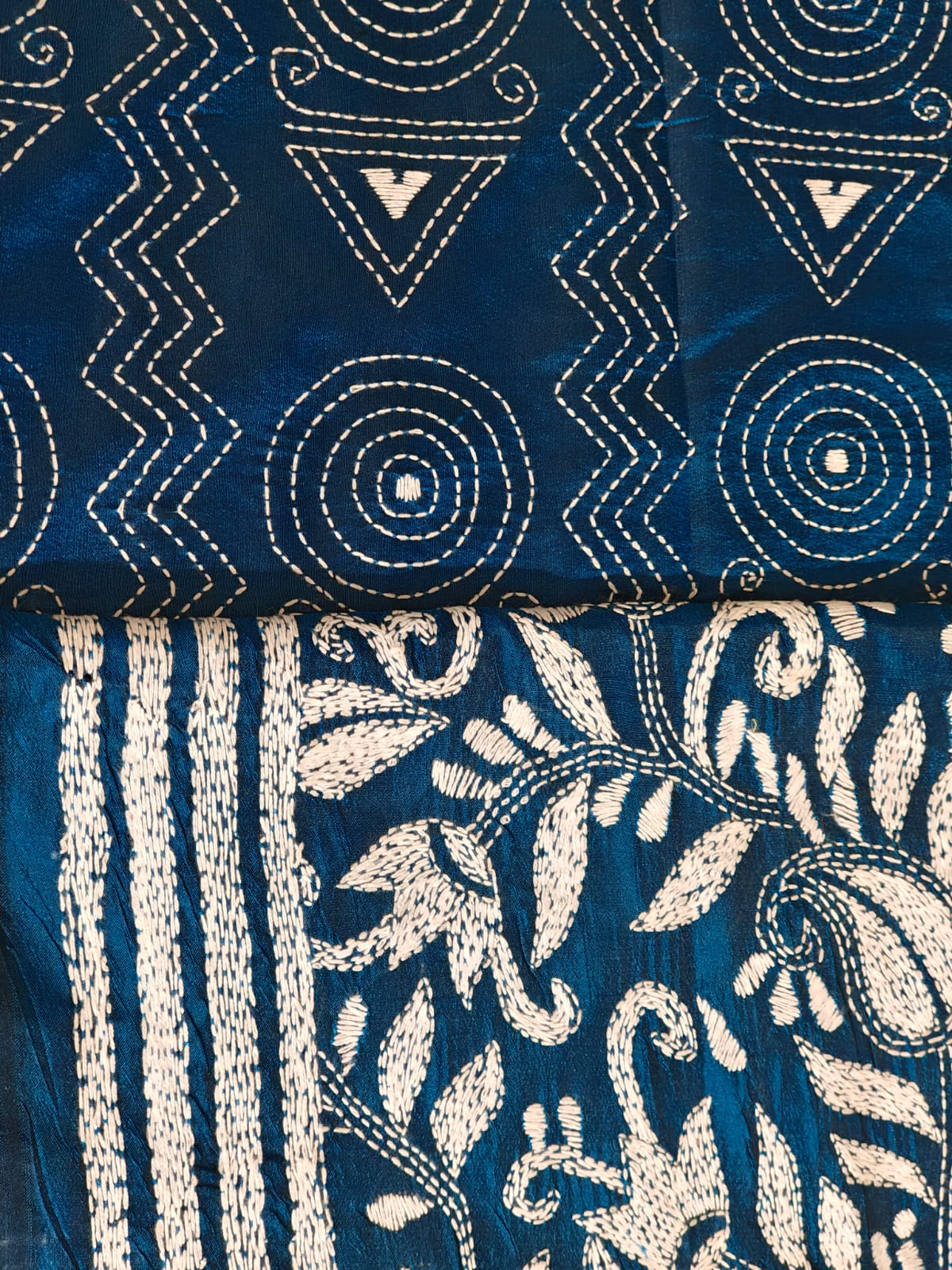 Description: Exquisite hand embroidery on royal blue blended Bangalore silk.