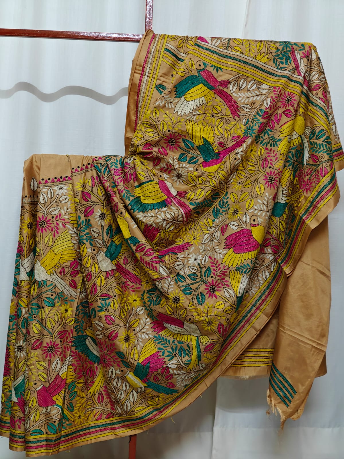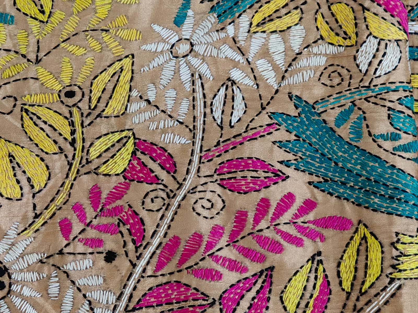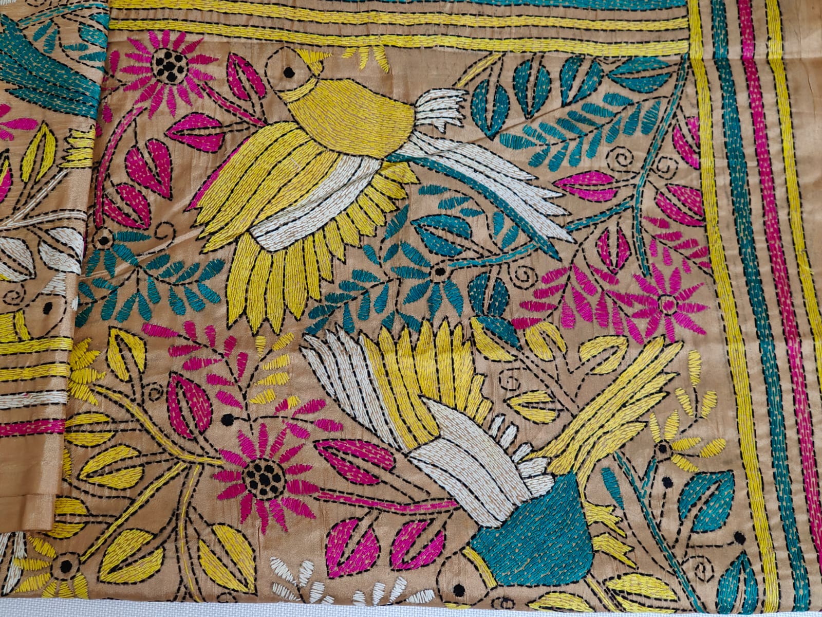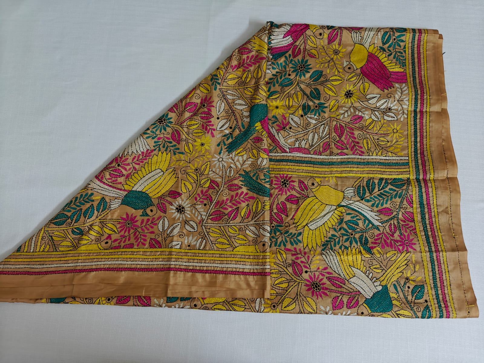 Description: 'Pakhi katha' embroidery on blended Bangalore silk.