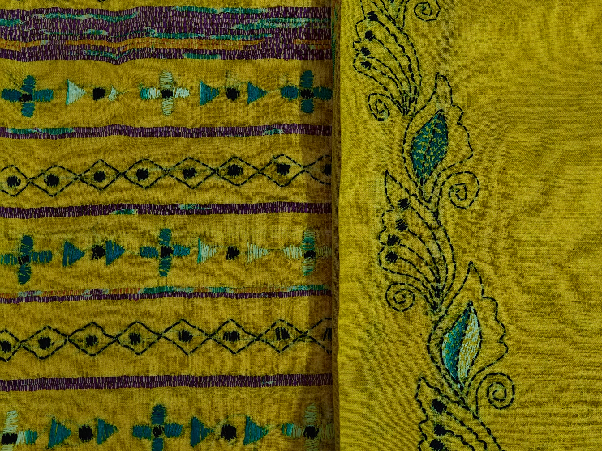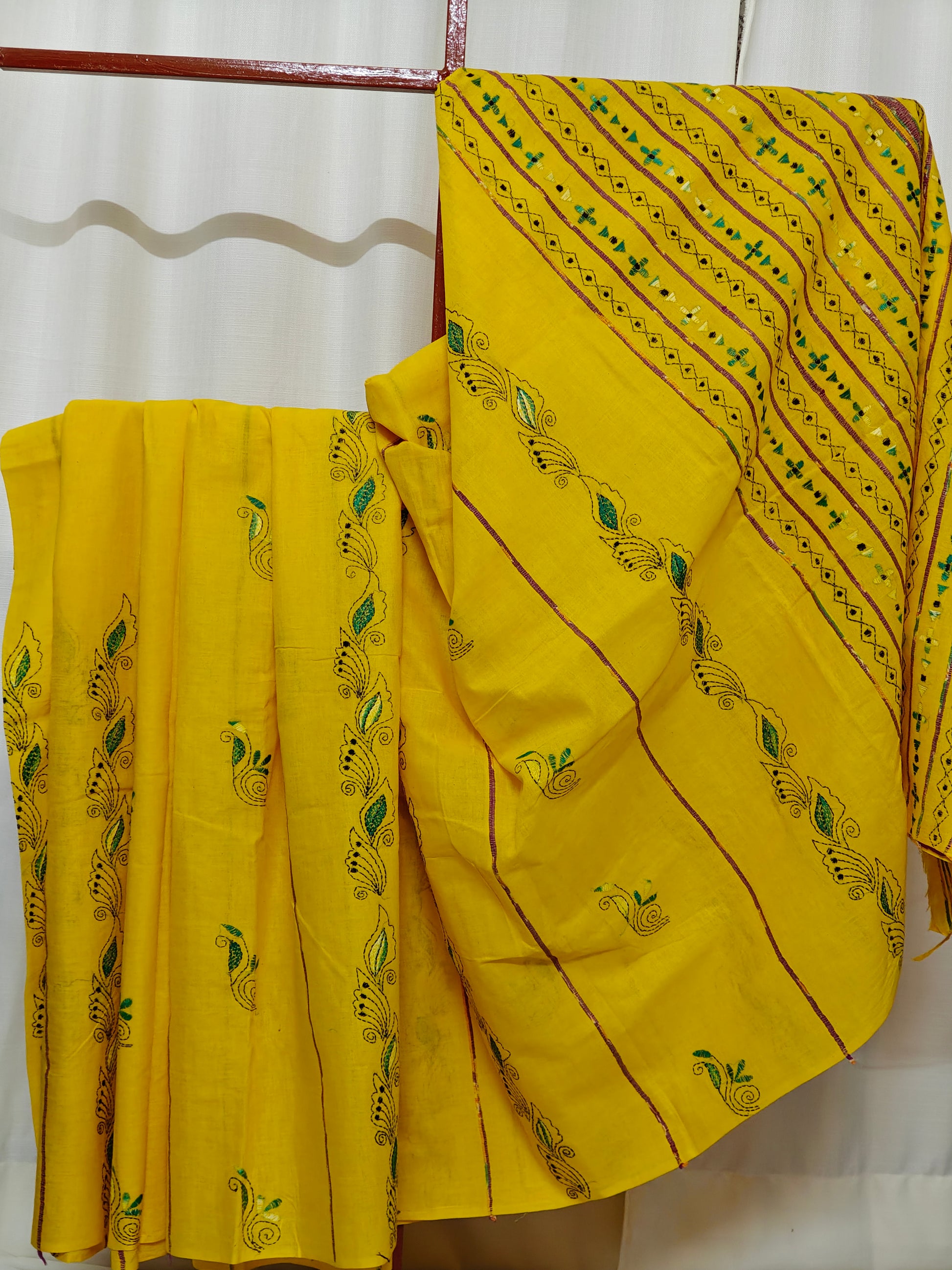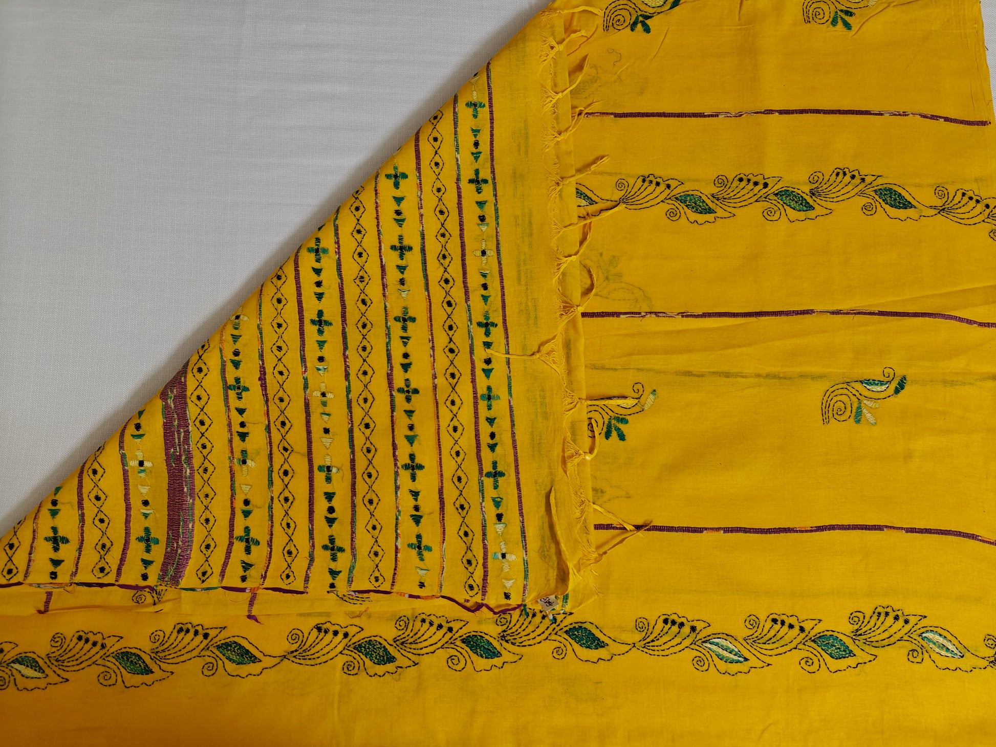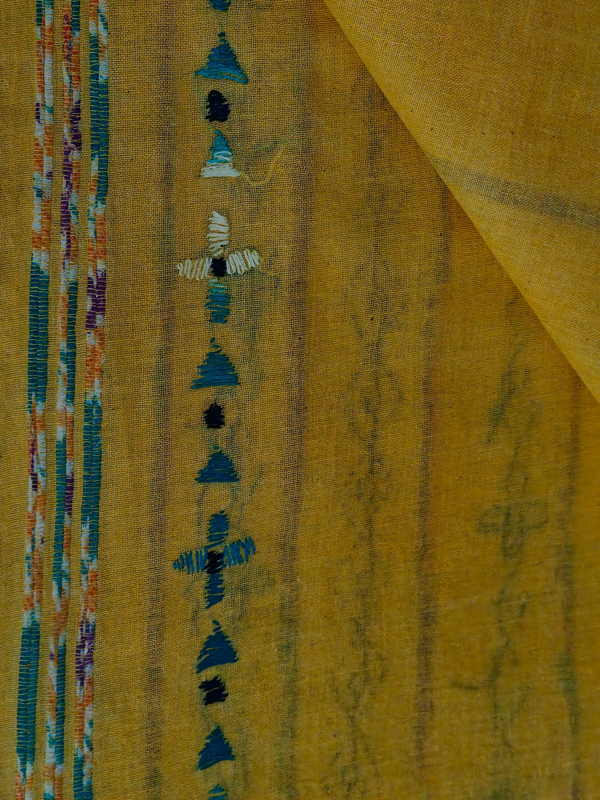 Description: Pure cotton saree with khesh lining. Yellow with blue, purple and black pattrens.
