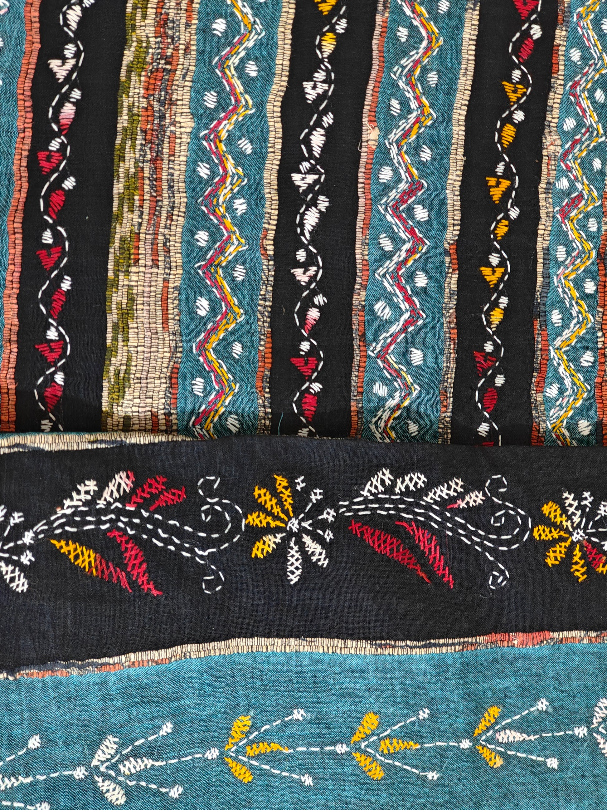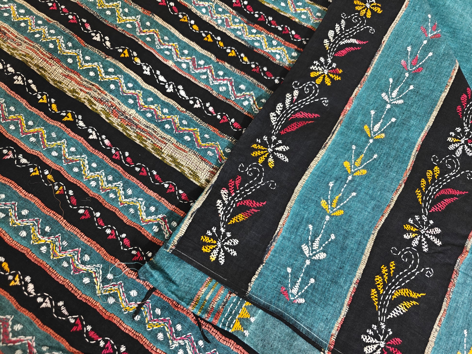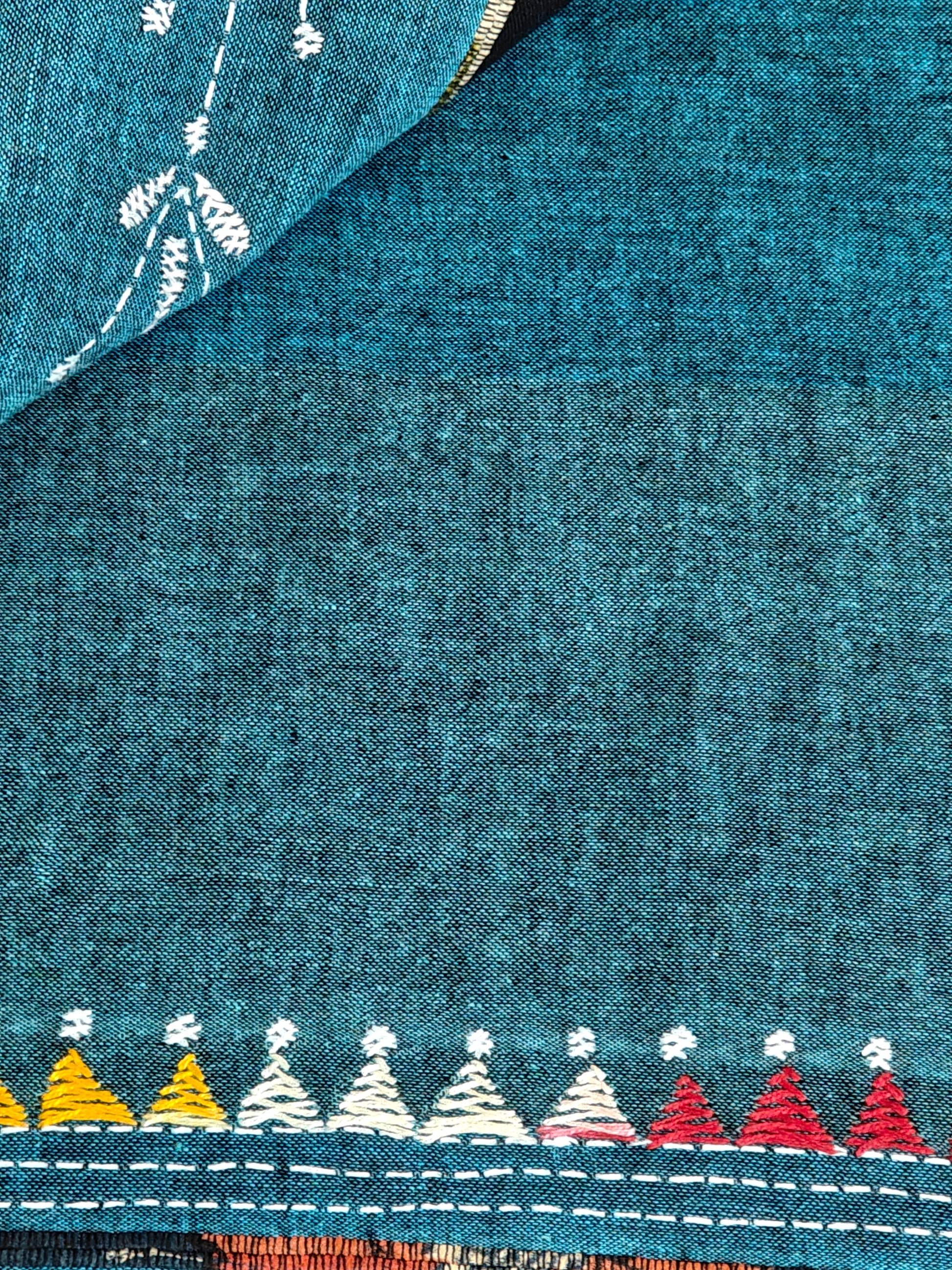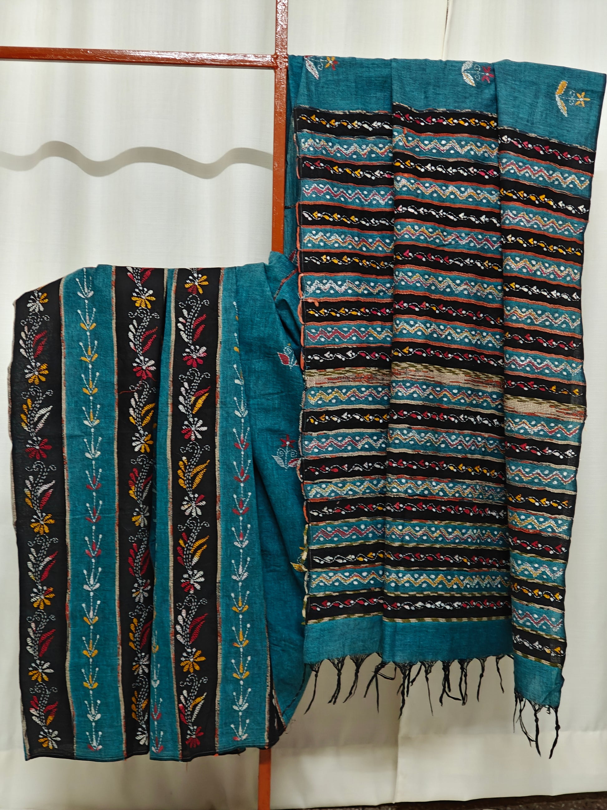 Description: Pure cotton saree with khesh lining. Teal with intricate floral and wave patterns.