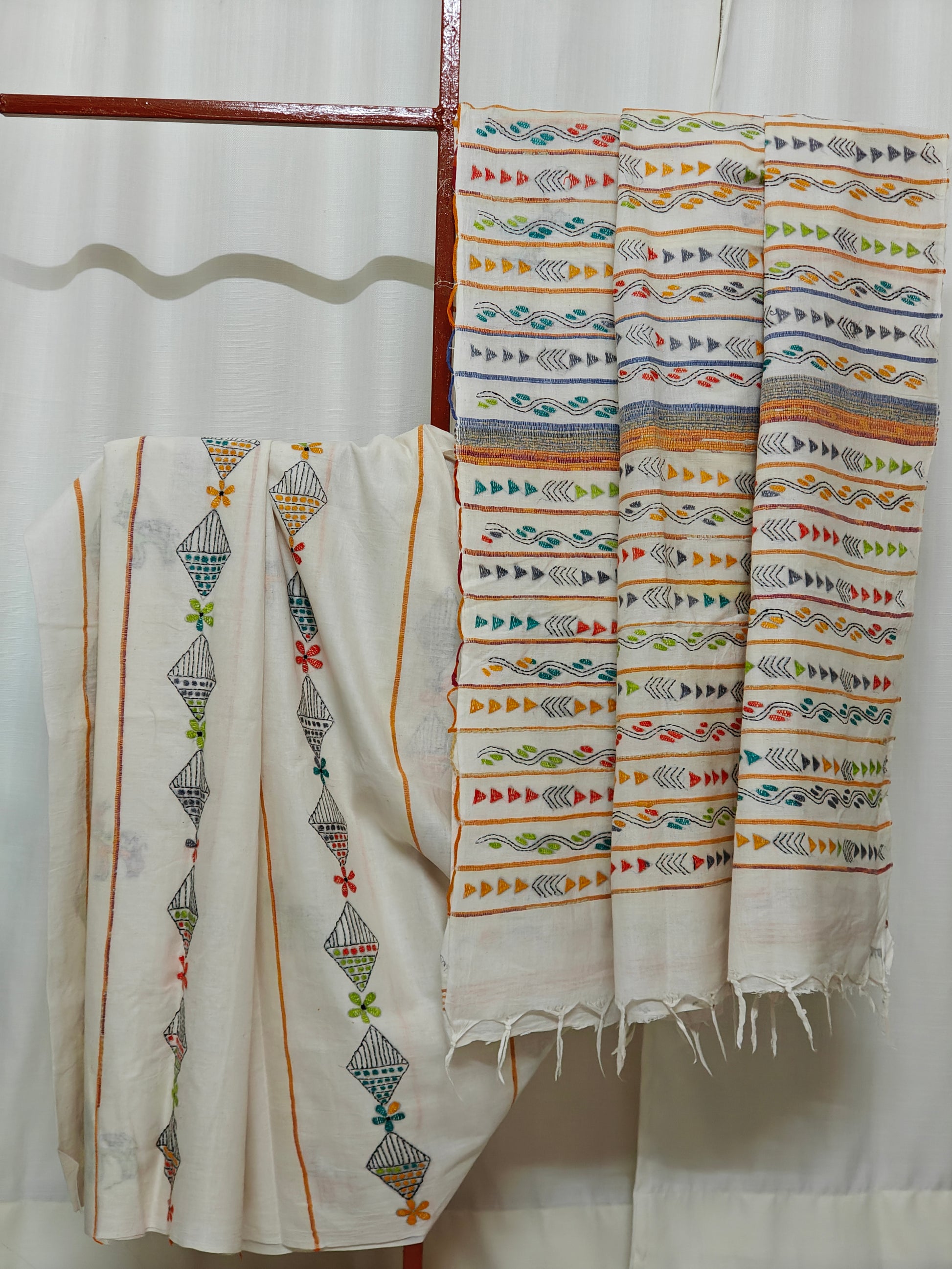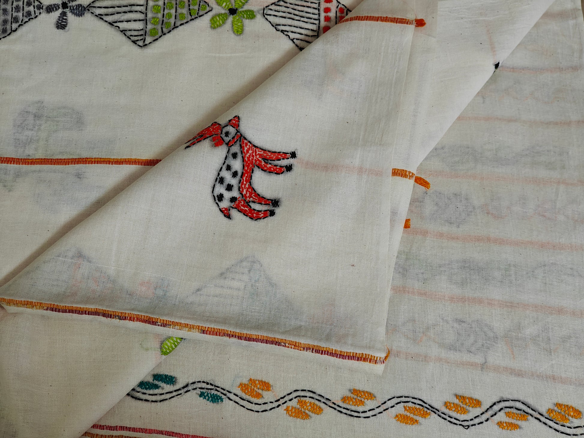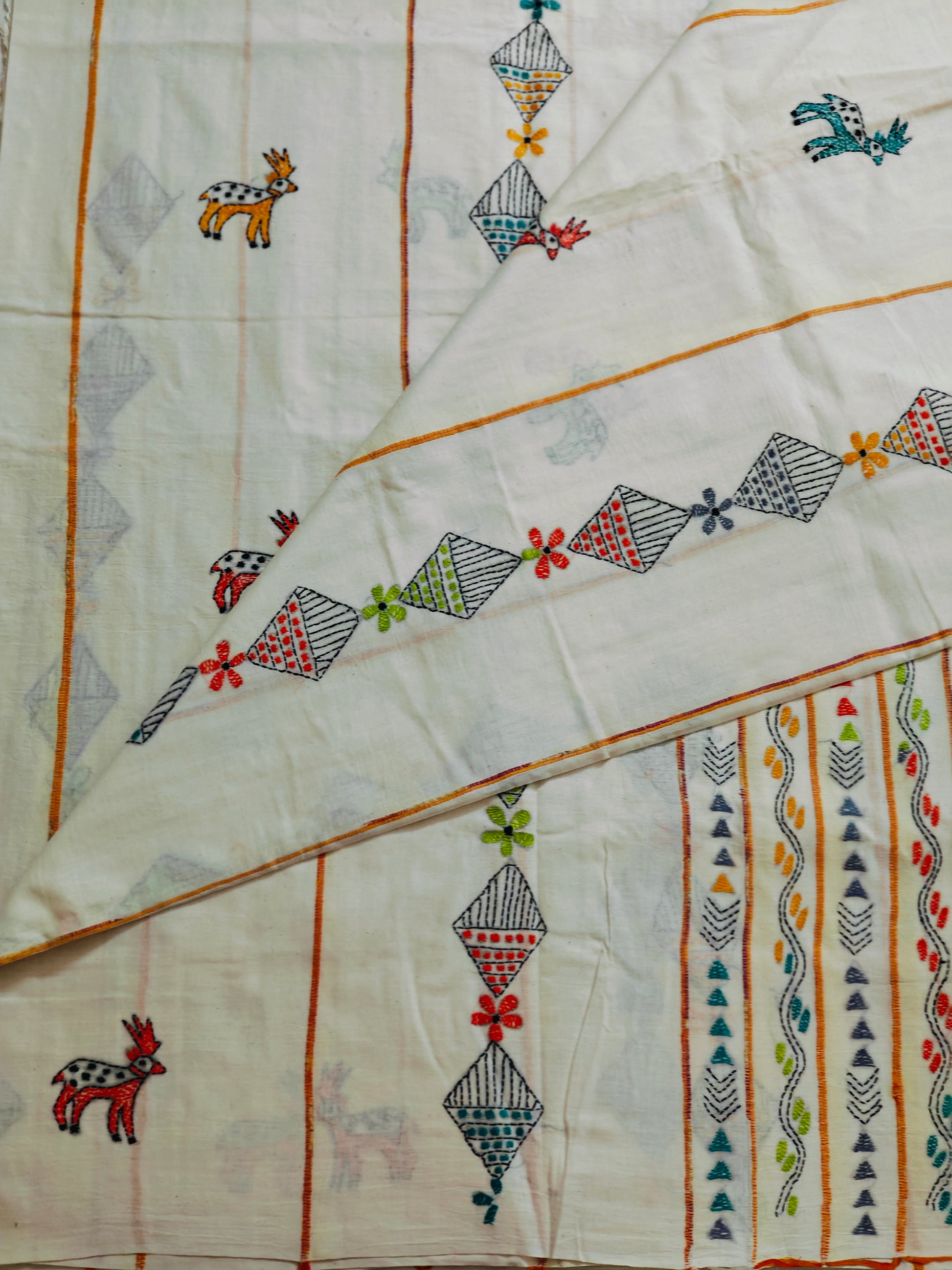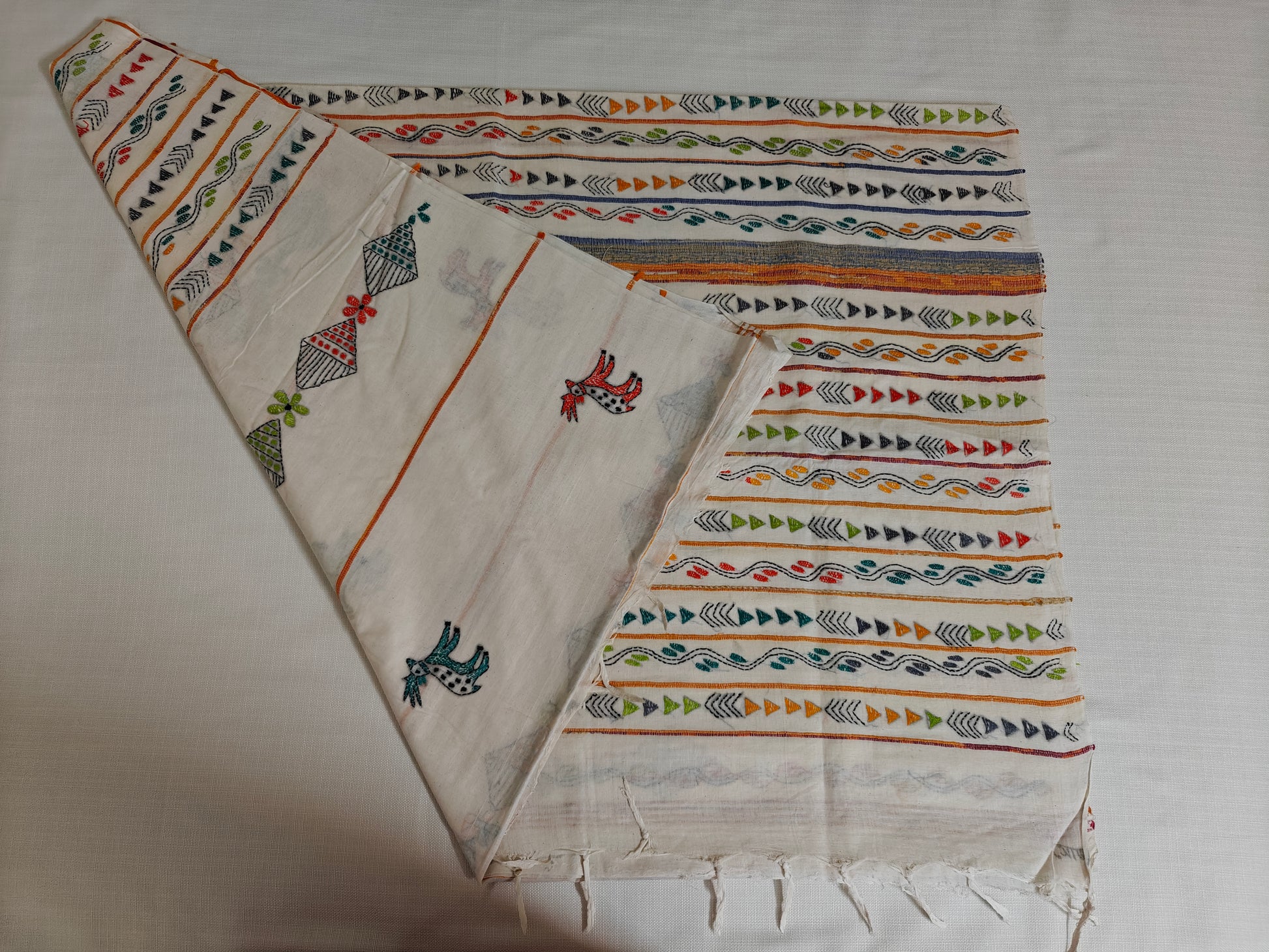 Description: Pure cotton saree with khesh lining. White with intricate angular and animal motifs.