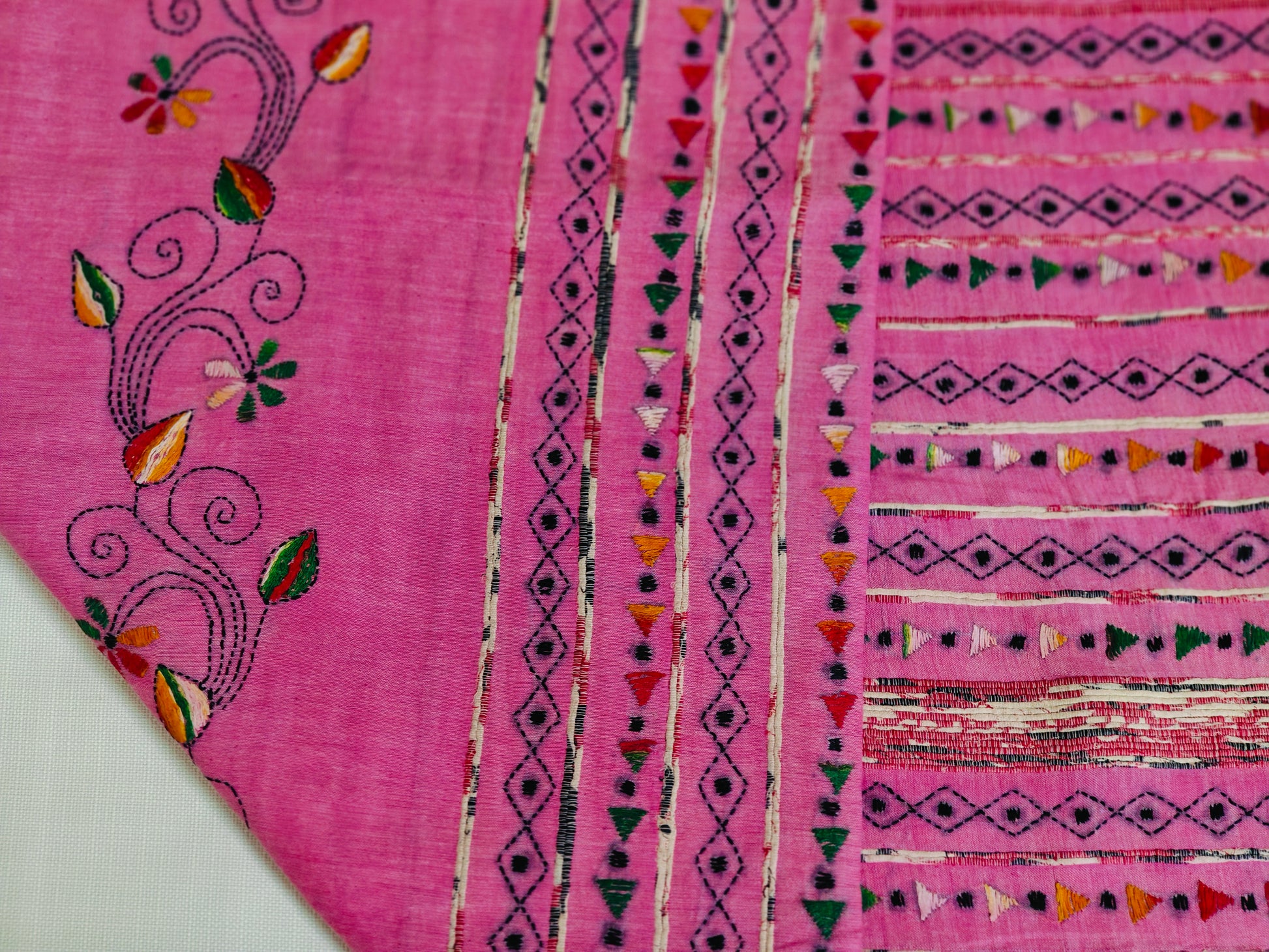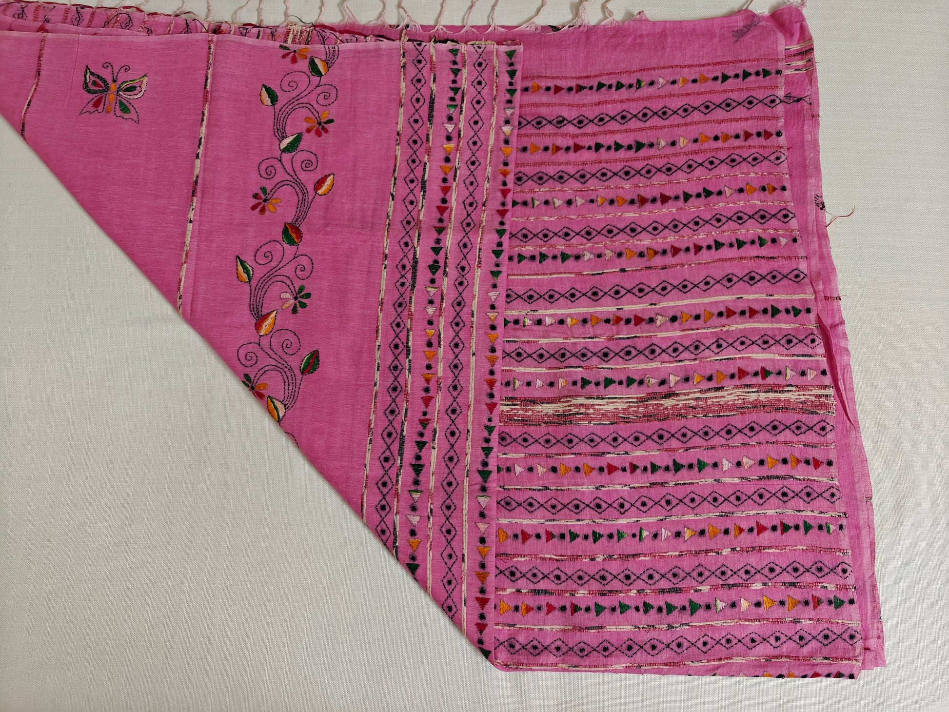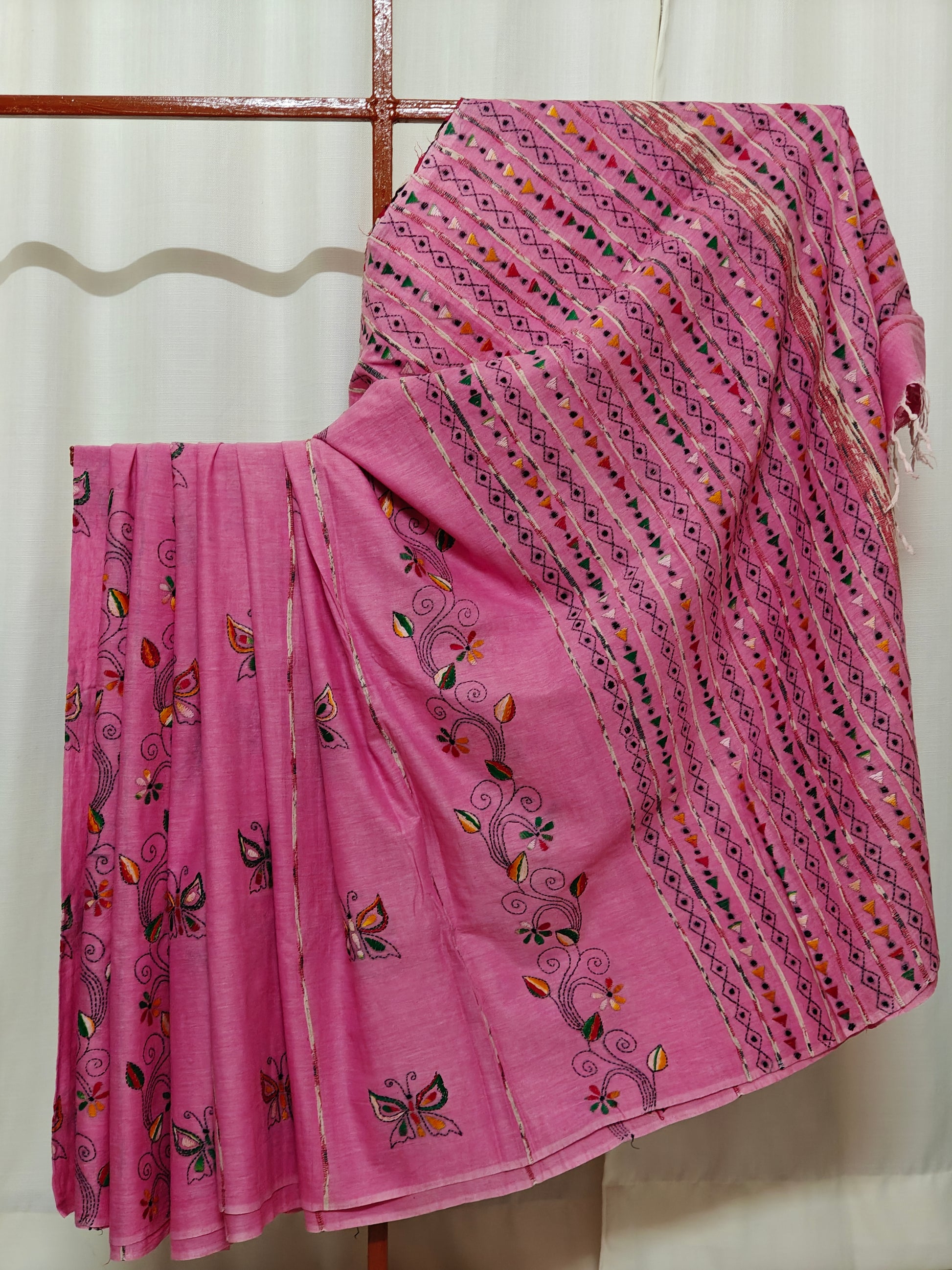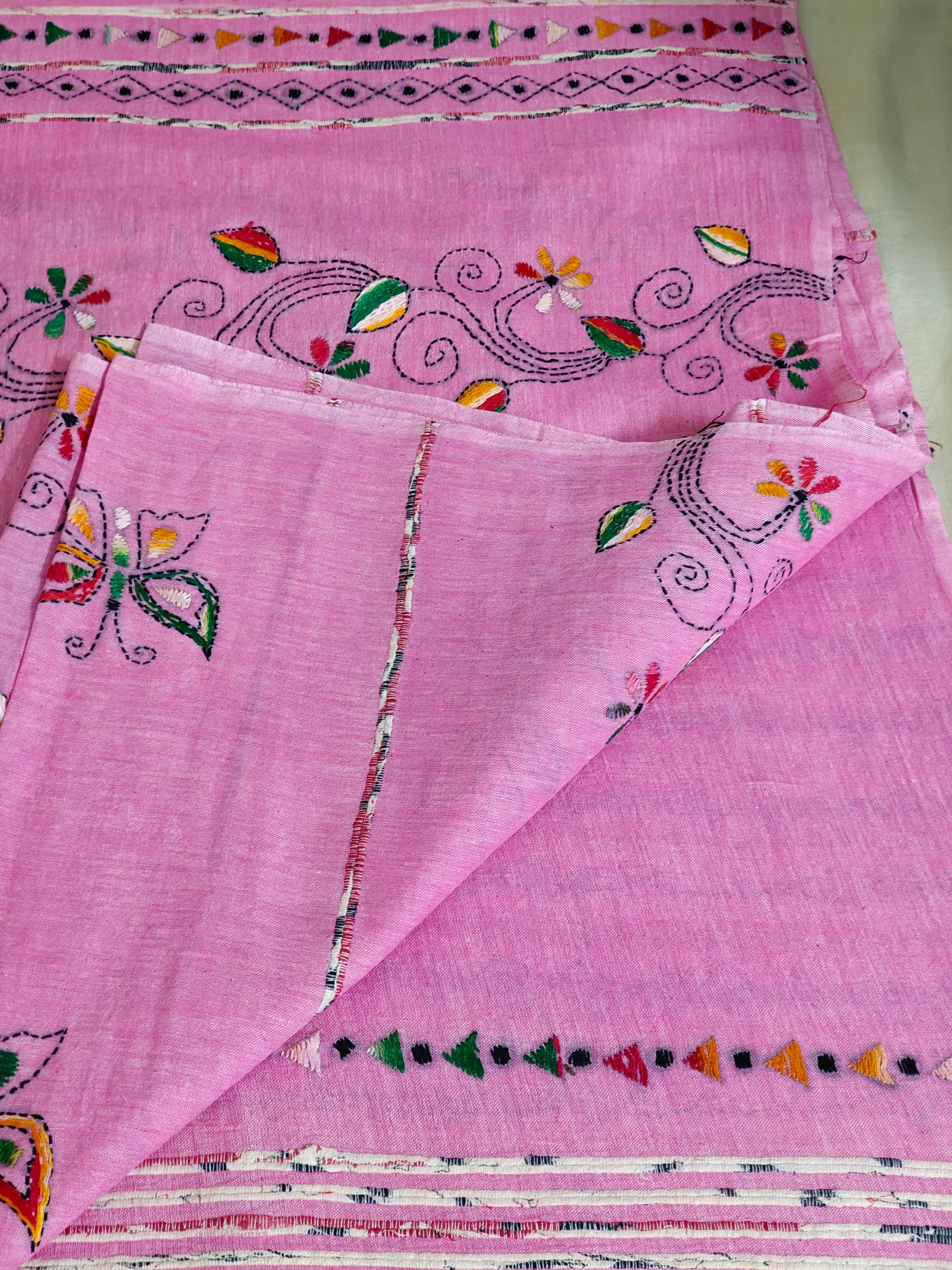 Description: Pure cotton saree with khesh lining. Candy floss pink with angular and butterfly patterns.