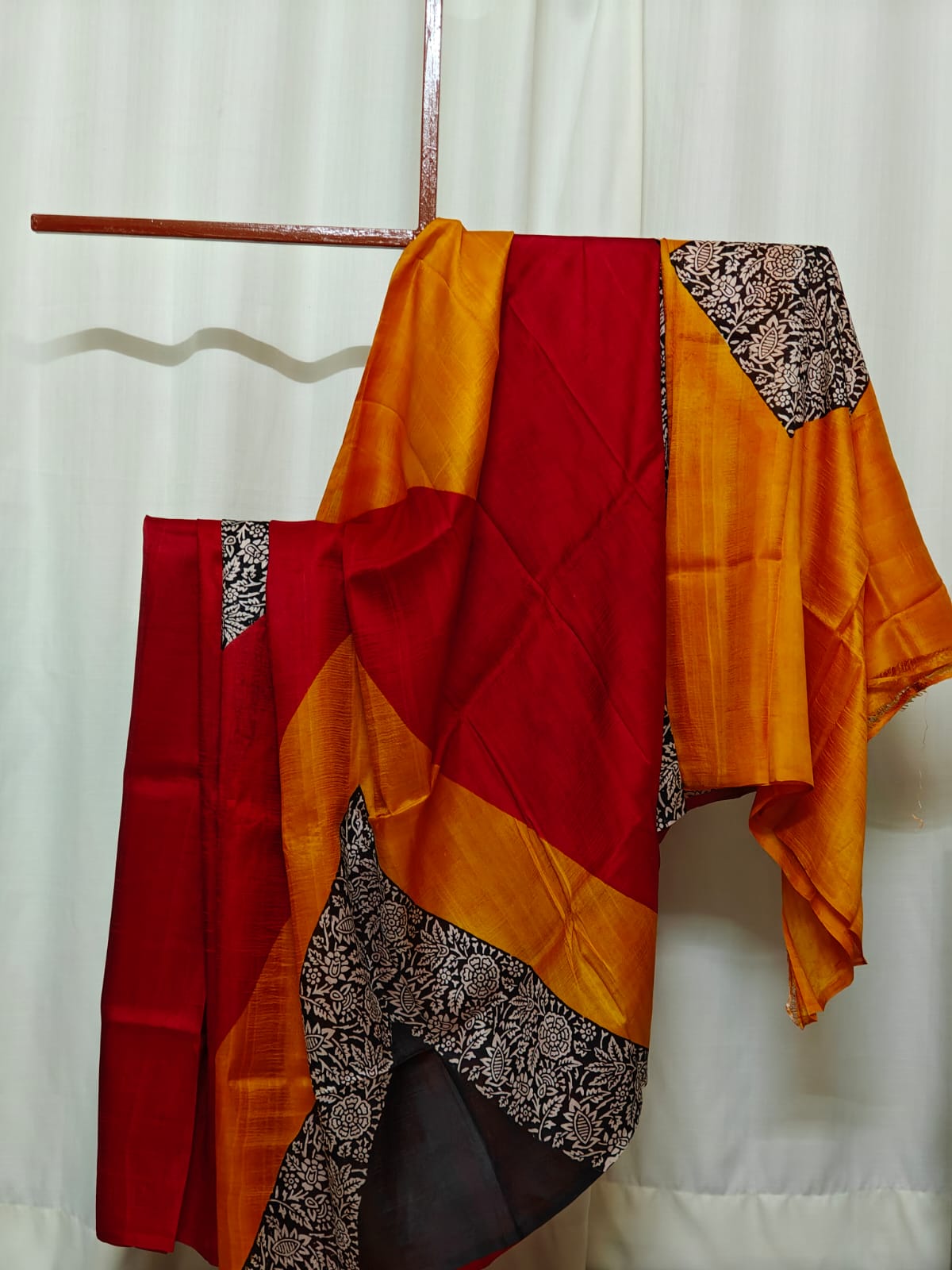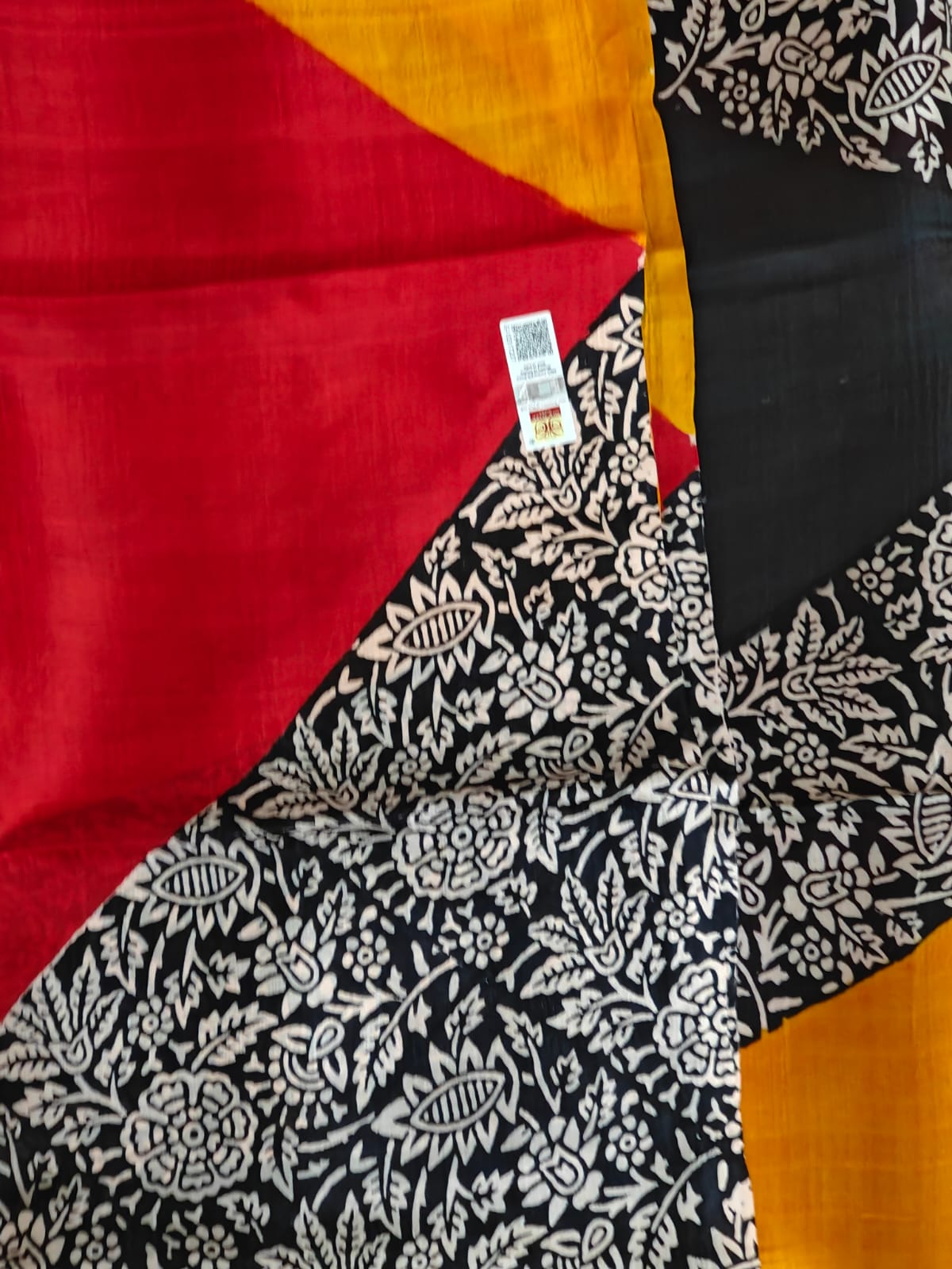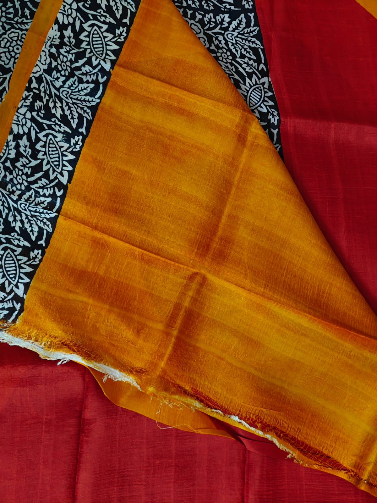 Description: Red, black and gold blockprint with intricate borders. Silk Mark certified.