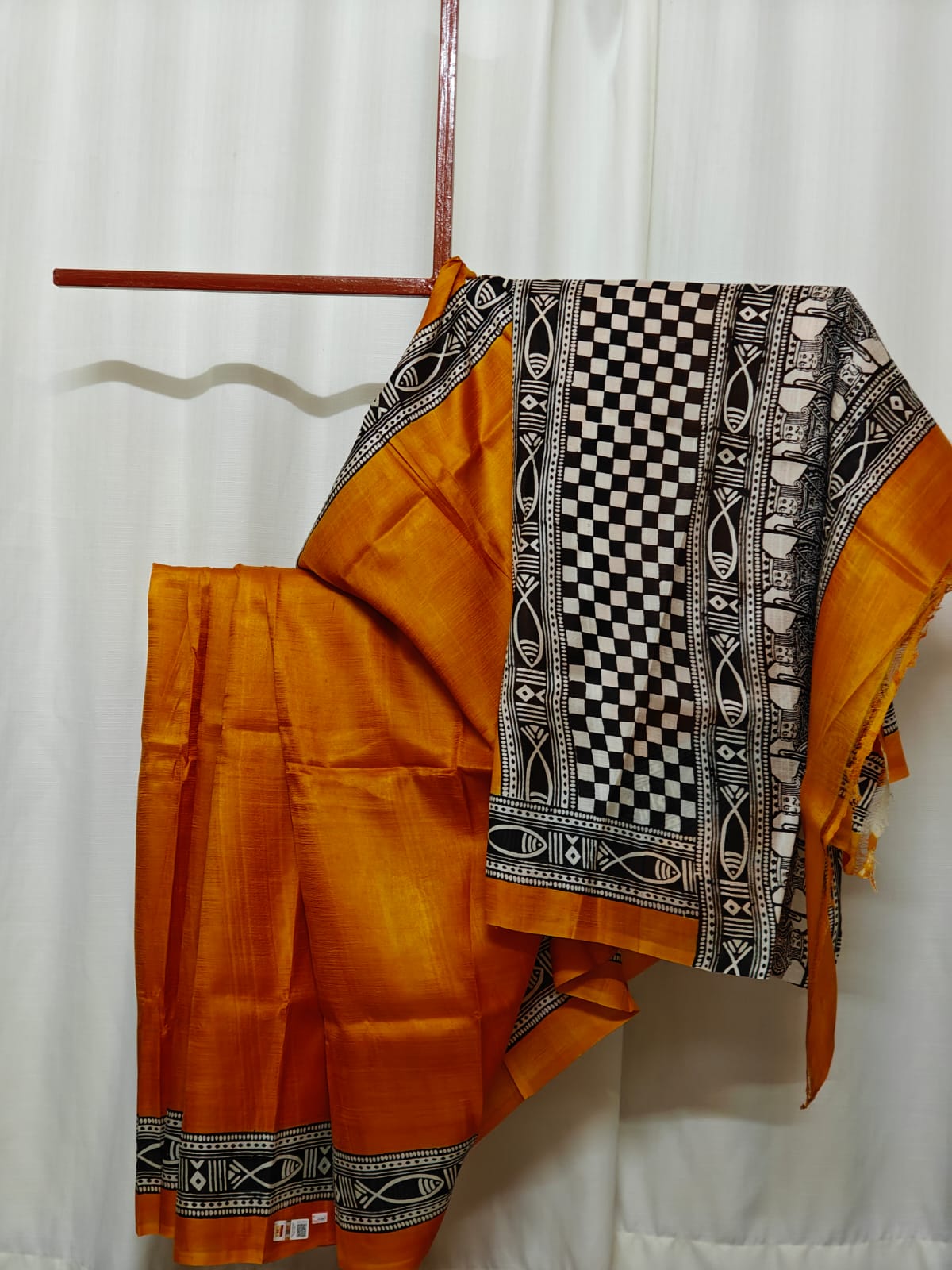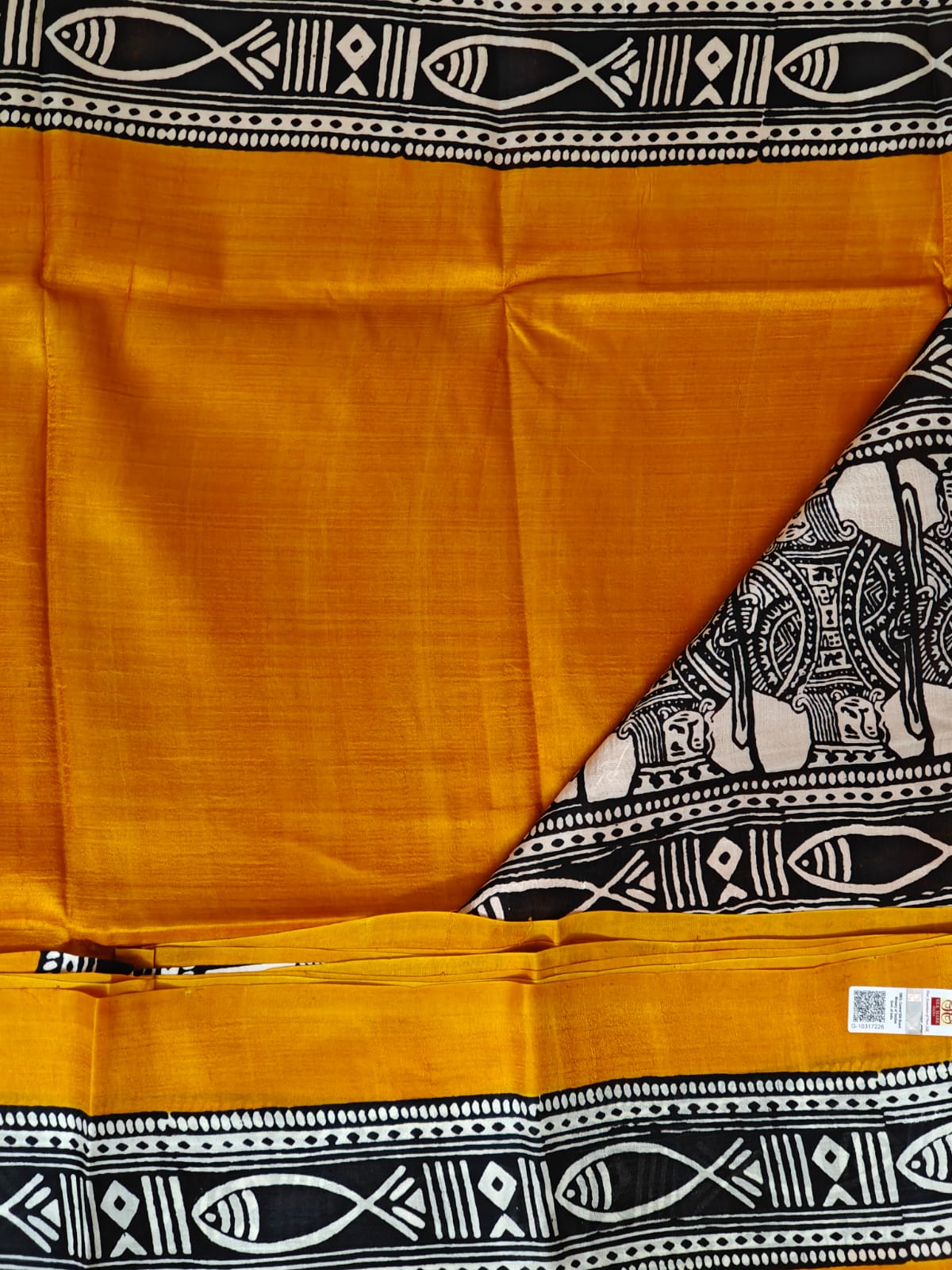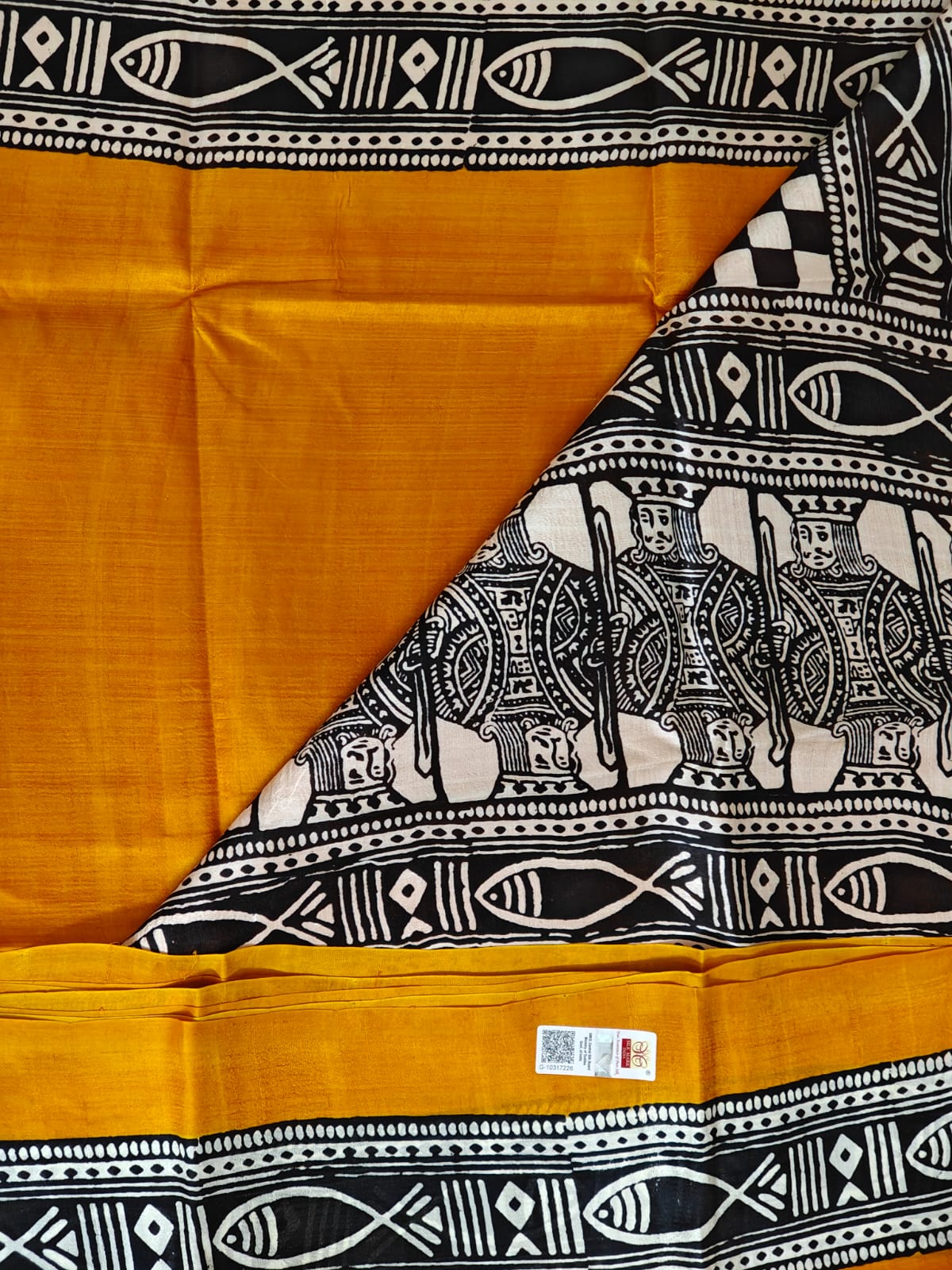 Description: Amber and black blockprint with fish and king motif on aanchal/pallu and borders. Silk Mark certified.