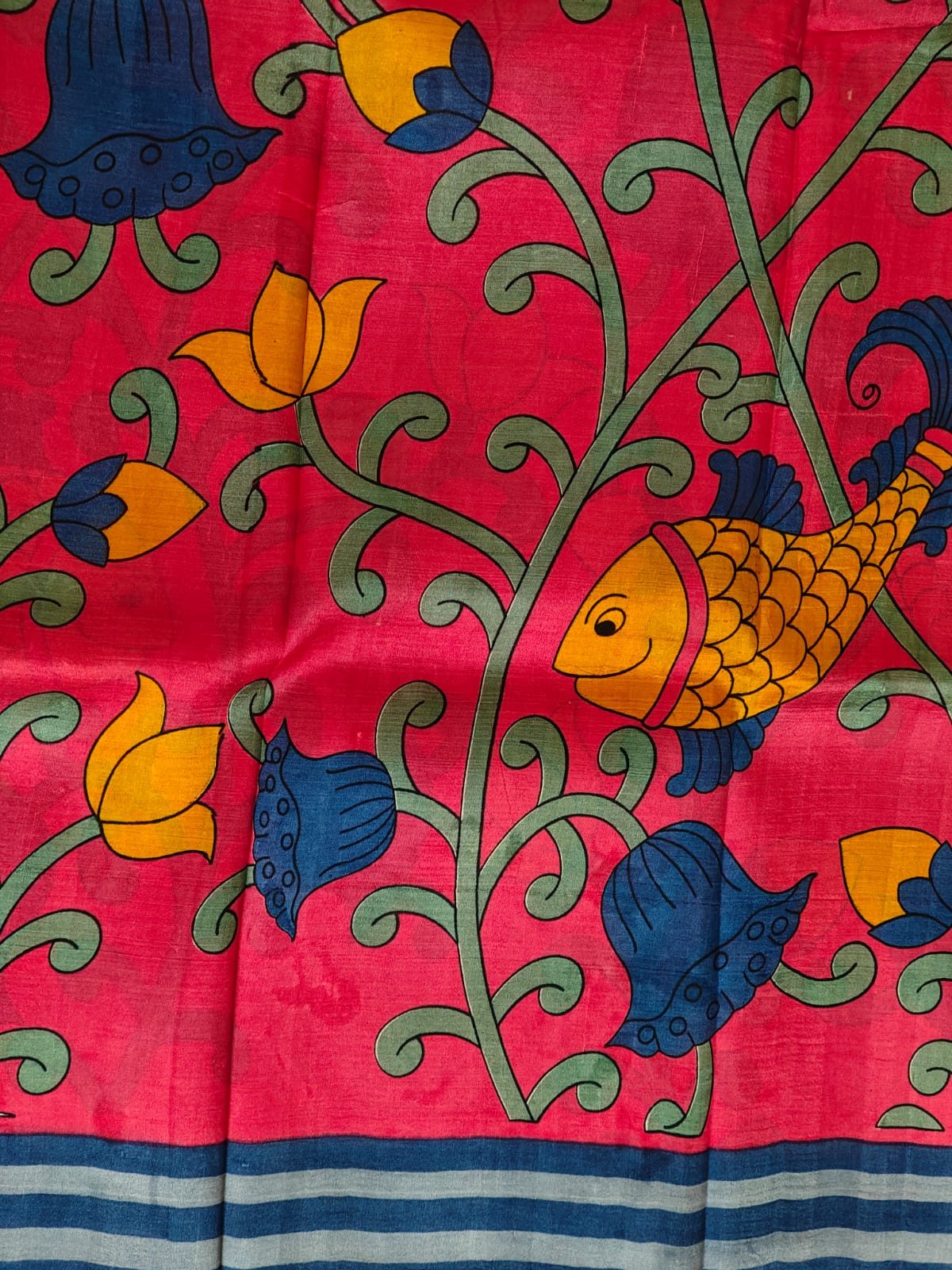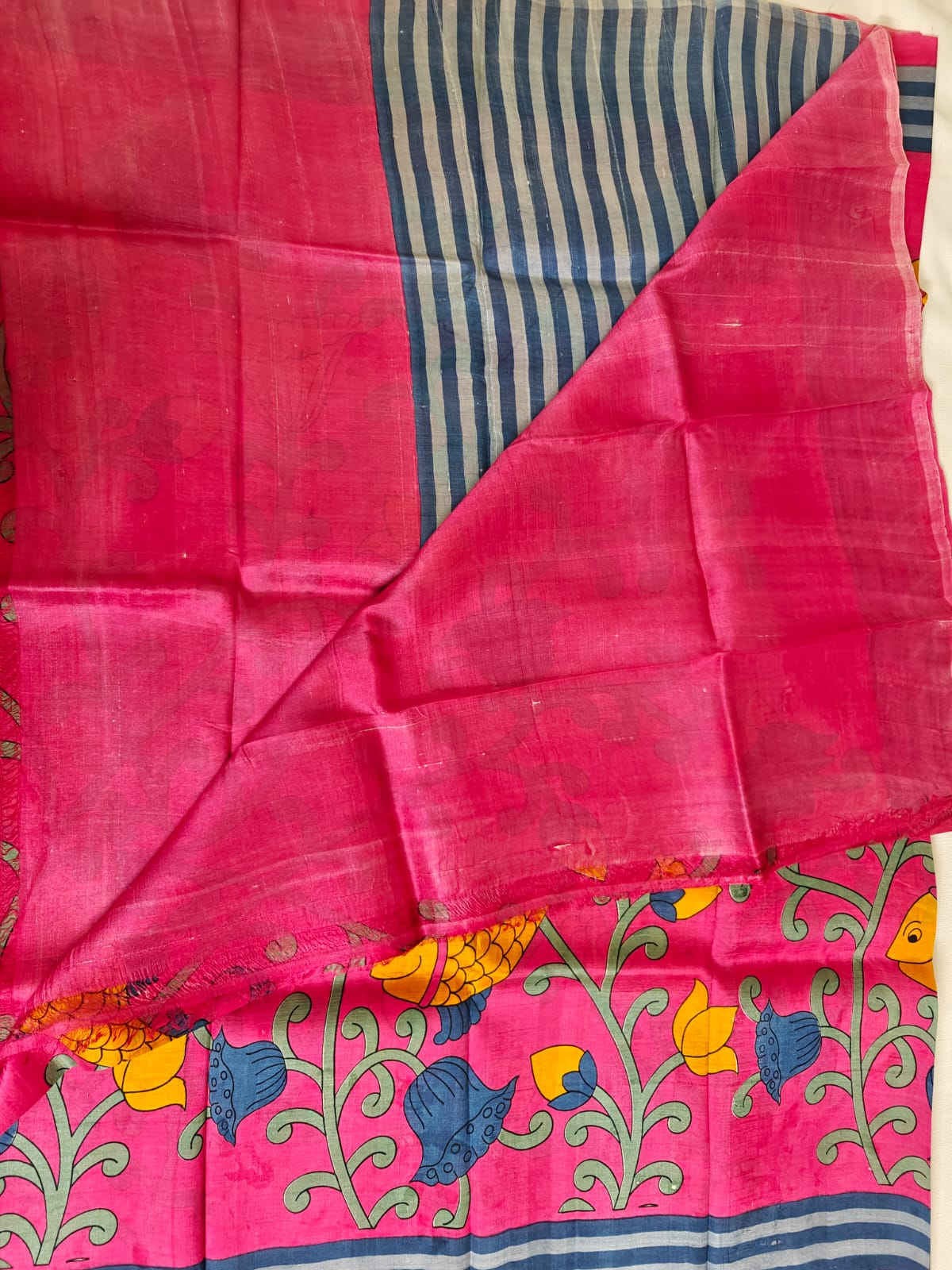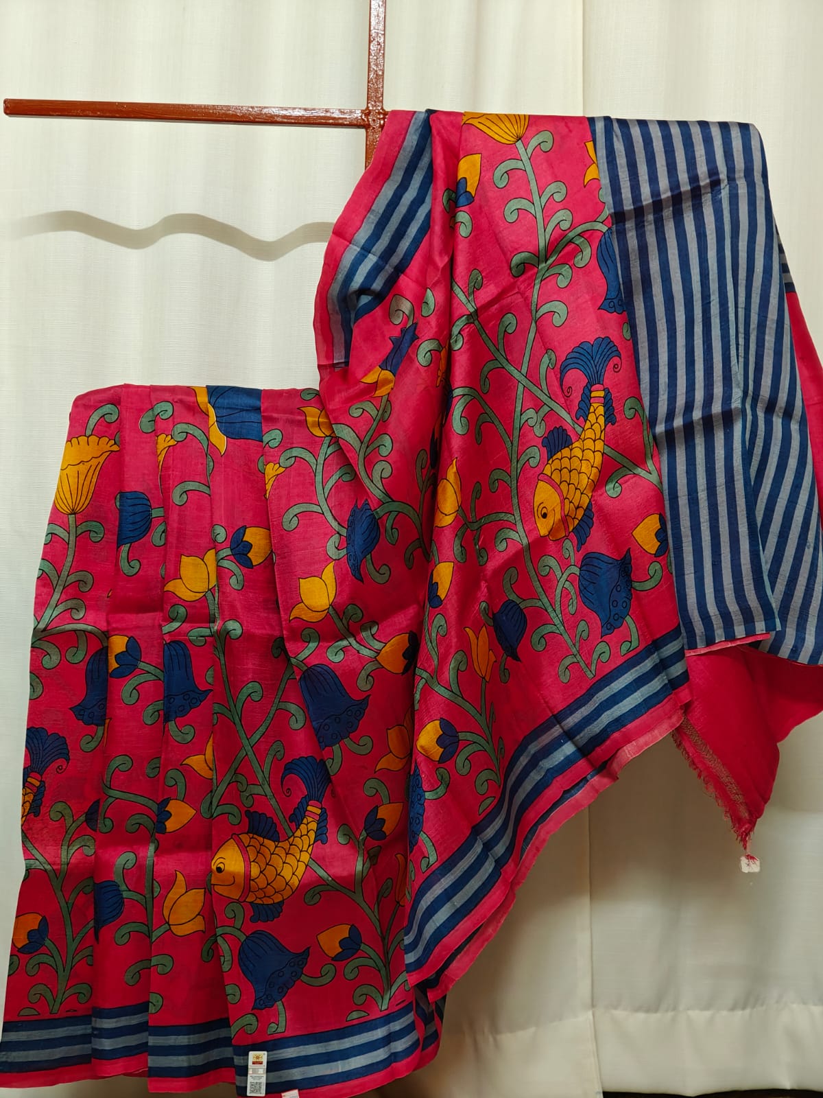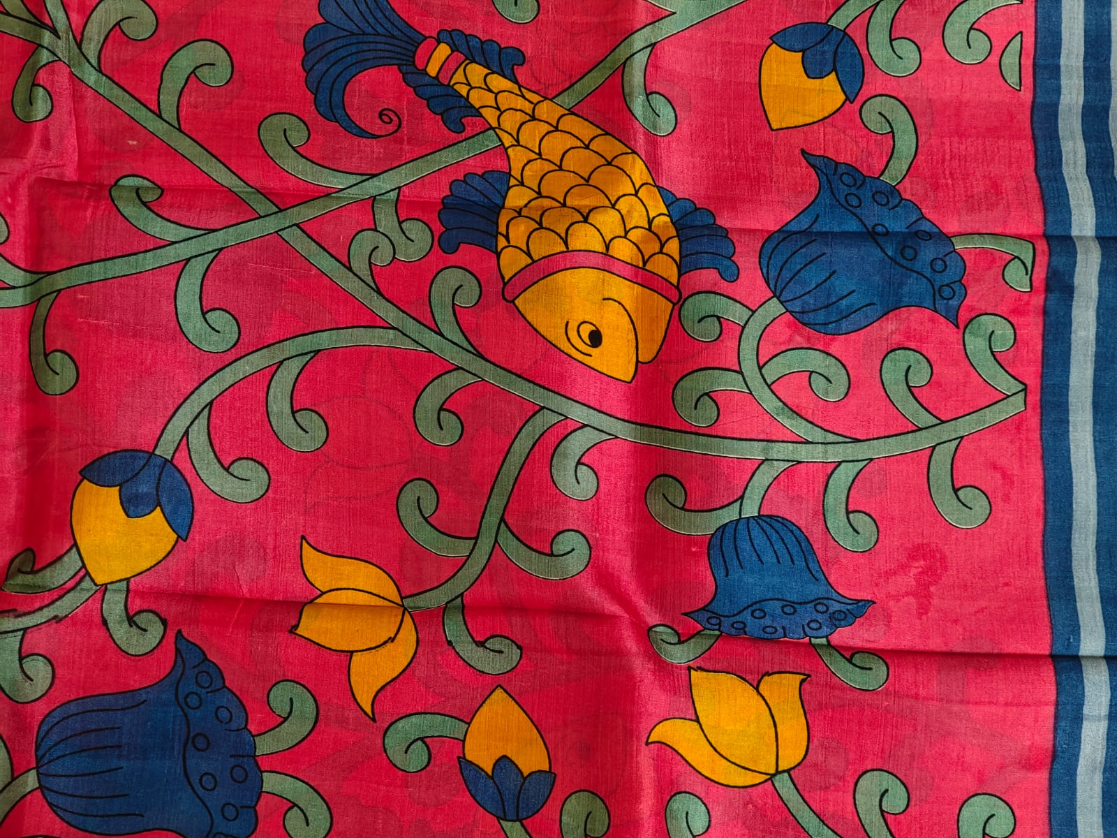 Description: 'Jongla' print blockprint saree. Silk Mark certified.
